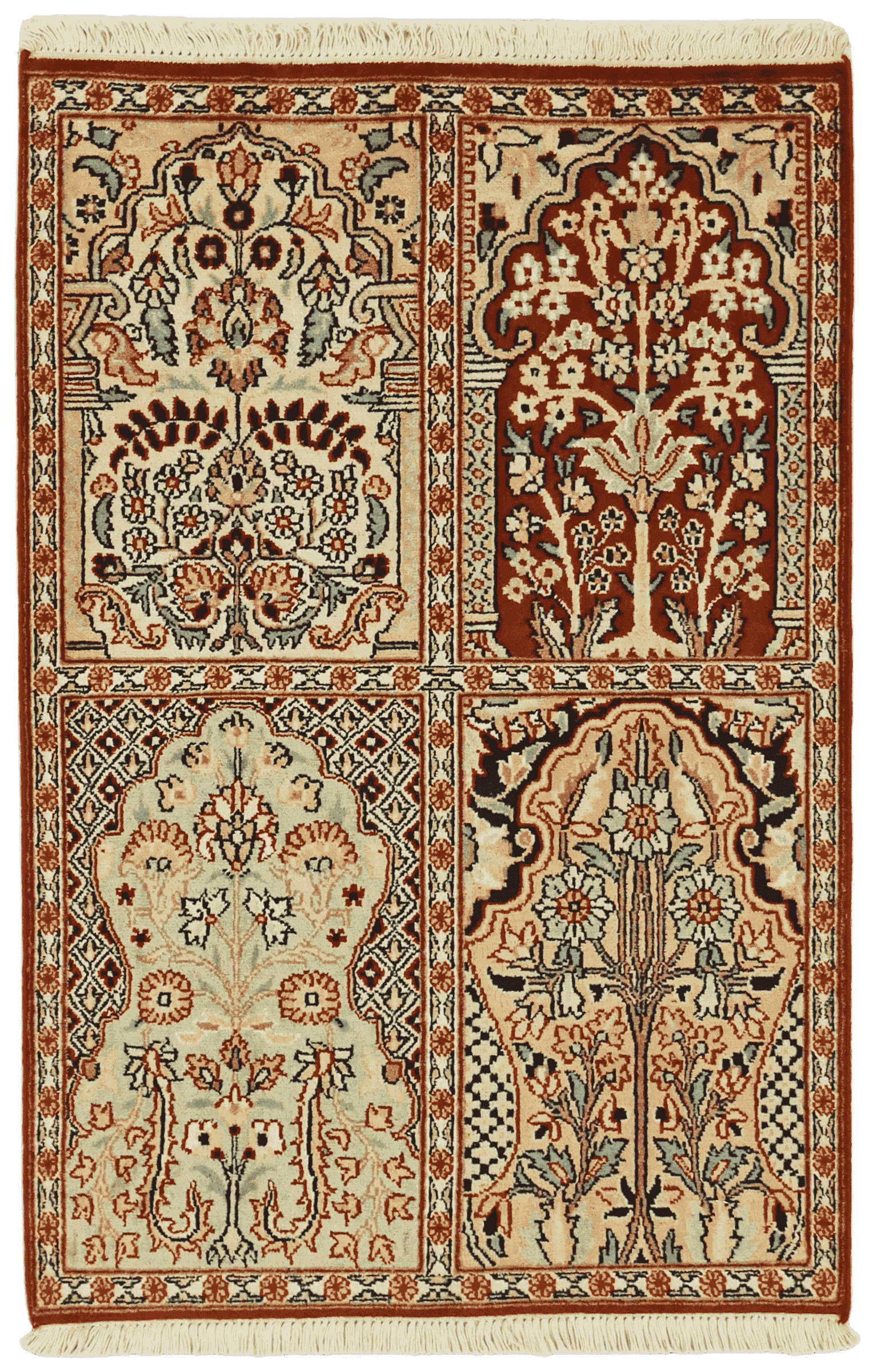 Ces tapis sont des symboles d'artisanat et de qualité. Les tapis en soie du Cachemire sont fabriqués à partir d'une soie de choix, réputée pour sa douceur, sa brillance et sa longévité. La soie du Cachemire est particulièrement fine et présente une densité de nouage de 450.000 à 500.000 nœuds par mètre carré. Des artisans expérimentés confectionnent souvent ces tapis à la main de manière très élaborée.