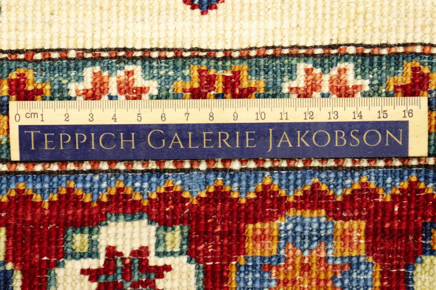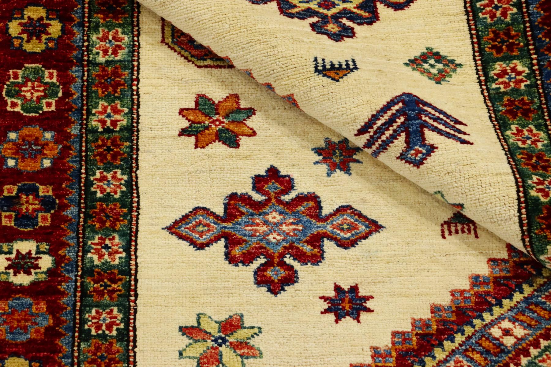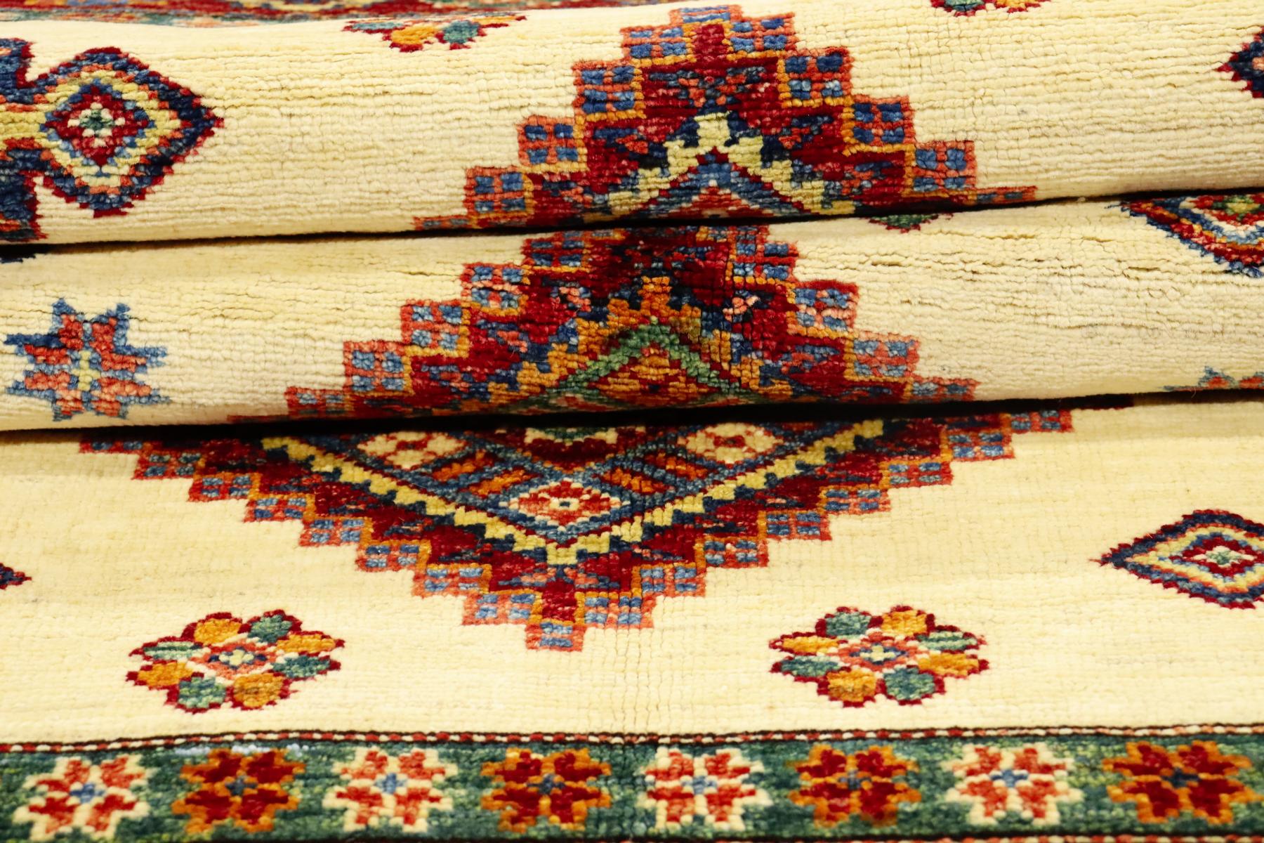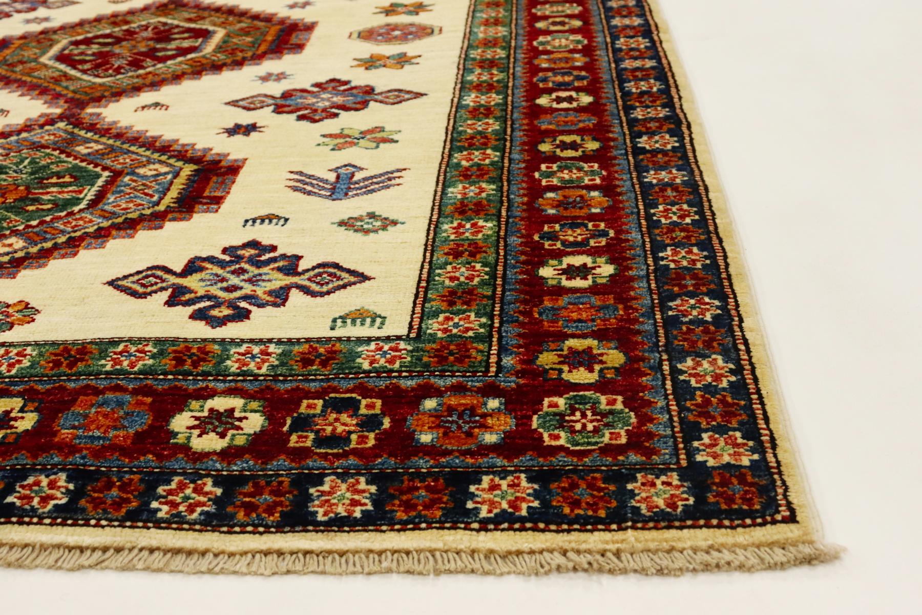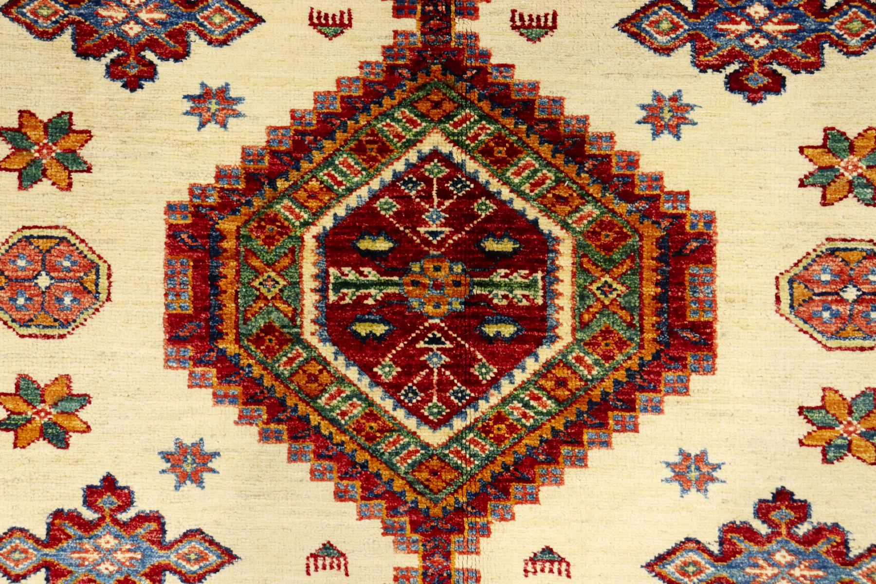 Kazak-Teppiche sind einzigartige handgeknüpfte Exemplare, mit kräftigen Farben und geometrischen Formen. Kazak-Teppiche werden traditionell aus natürliche Pflanzen Farben gefärbt und mit afghanischer Wolle hergestellt. Die handgesponnene Wolle stammt aus der Region Ghazni. Durch die aufwendige Waschmethode erhalten sie einen schönen glänzenden und seidigen Stil. Dieser Teppich bringt Behaglichkeit in den Raum, ist ausdrucksstark und voller Energie.