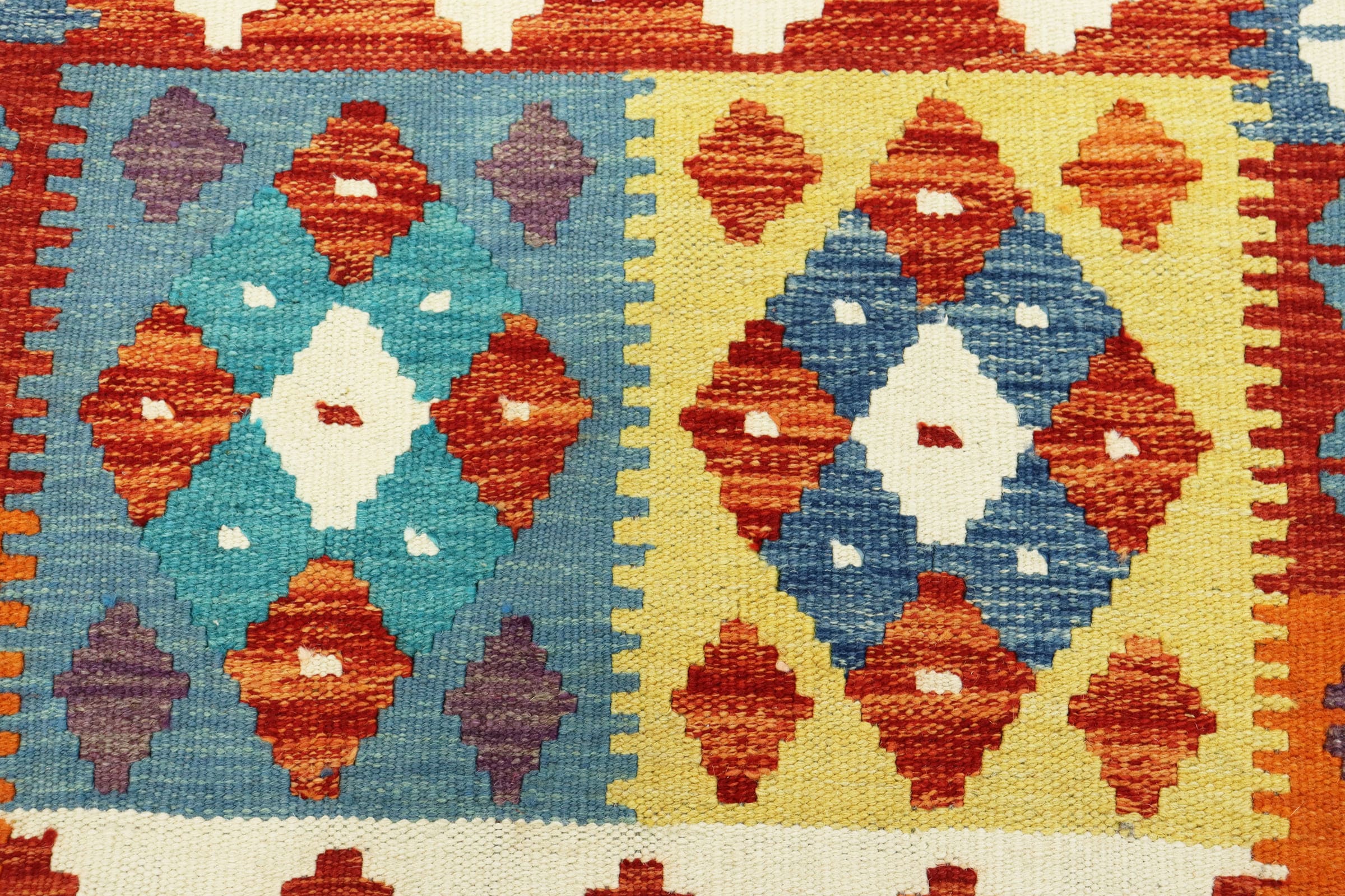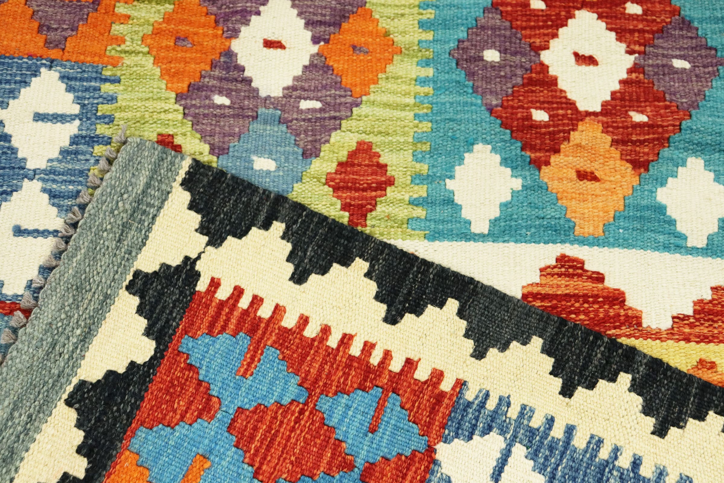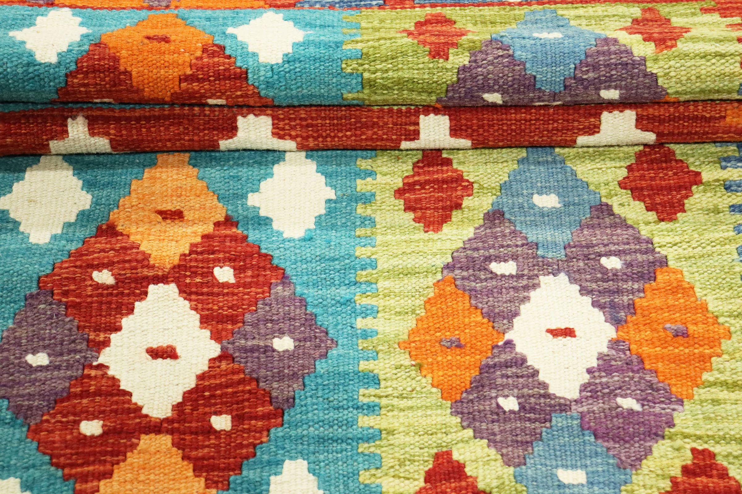 Dieser handgewebte Kelim-Teppich ist ein Kunstwerk aus naturbelassener Wolle. Die Besonderheit dieses Teppichs liegt darin, dass die Wolle von Hand gesponnen und mit natürlichen Pflanzenfarben veredelt wurde. Diese besonderen Exemplare, verwurzelt in alter Tradition, sind künstlerische Darstellungen, die die reiche kulturelle Vielfalt und das kunstvolle Handwerk des Orients eindrucksvoll zum Ausdruck bringen.