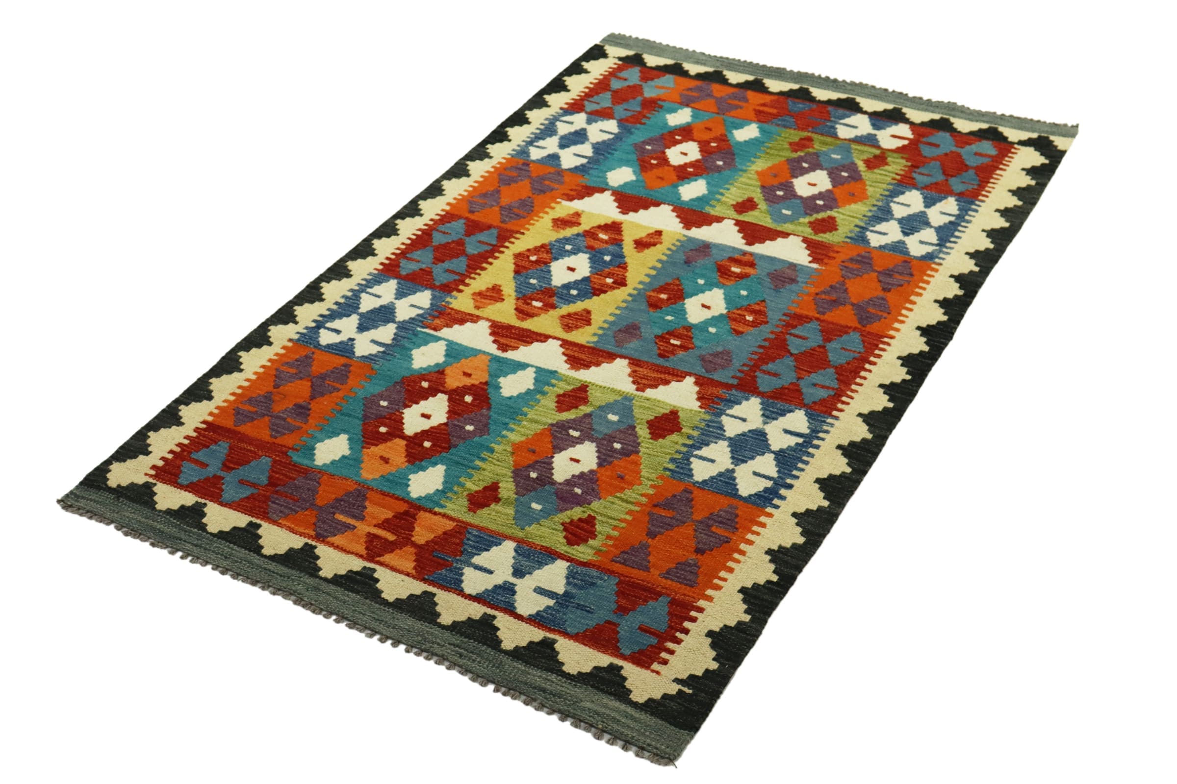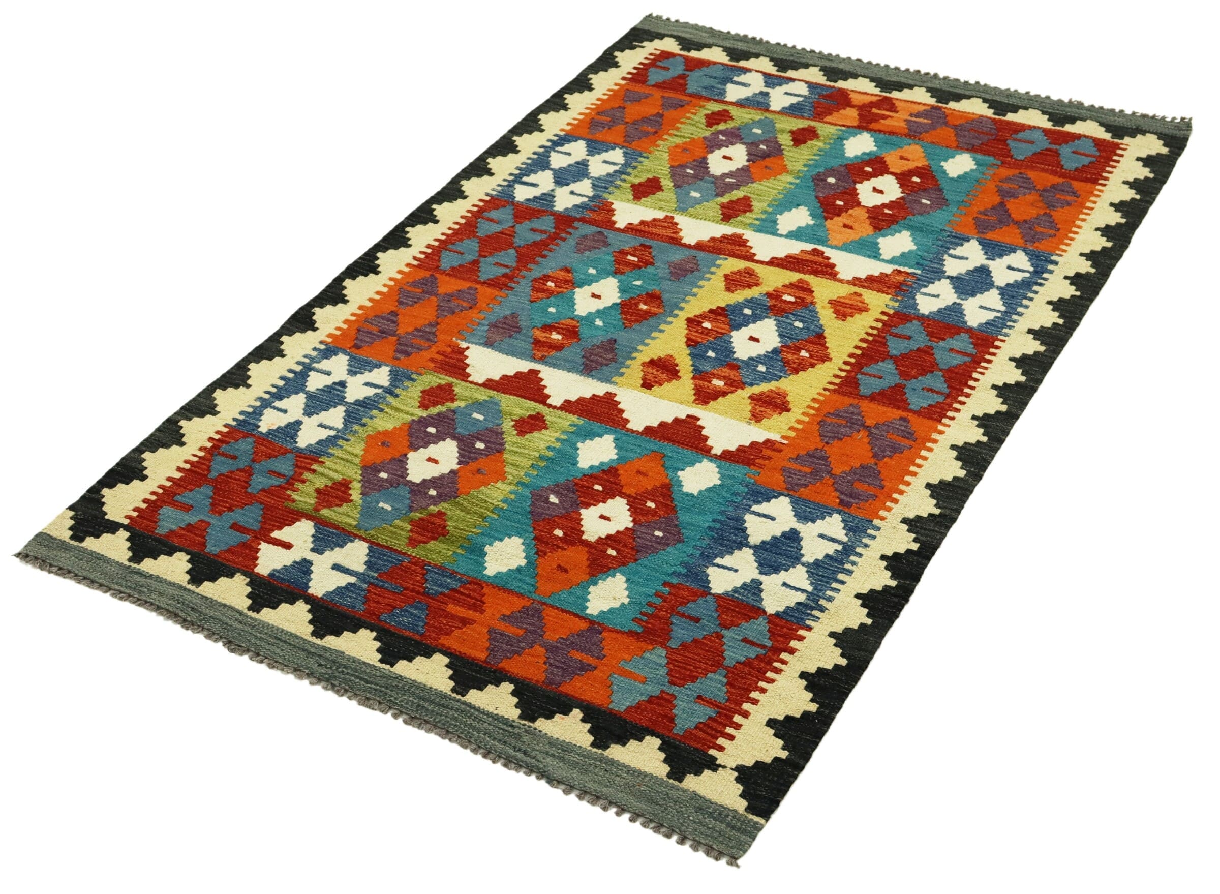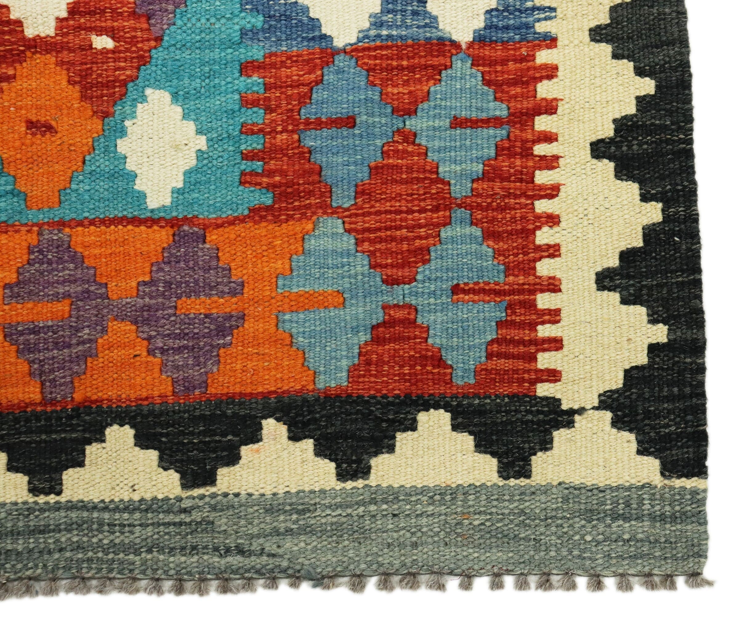 Dieser handgewebte Kelim-Teppich ist ein Kunstwerk aus naturbelassener Wolle. Die Besonderheit dieses Teppichs liegt darin, dass die Wolle von Hand gesponnen und mit natürlichen Pflanzenfarben veredelt wurde. Diese besonderen Exemplare, verwurzelt in alter Tradition, sind künstlerische Darstellungen, die die reiche kulturelle Vielfalt und das kunstvolle Handwerk des Orients eindrucksvoll zum Ausdruck bringen.