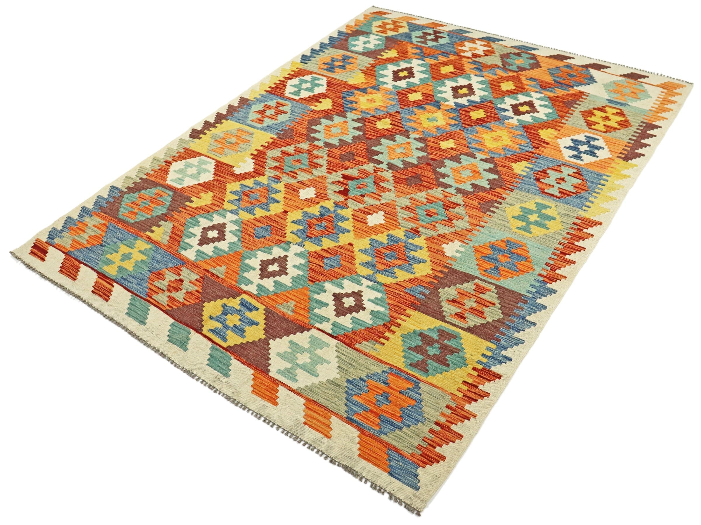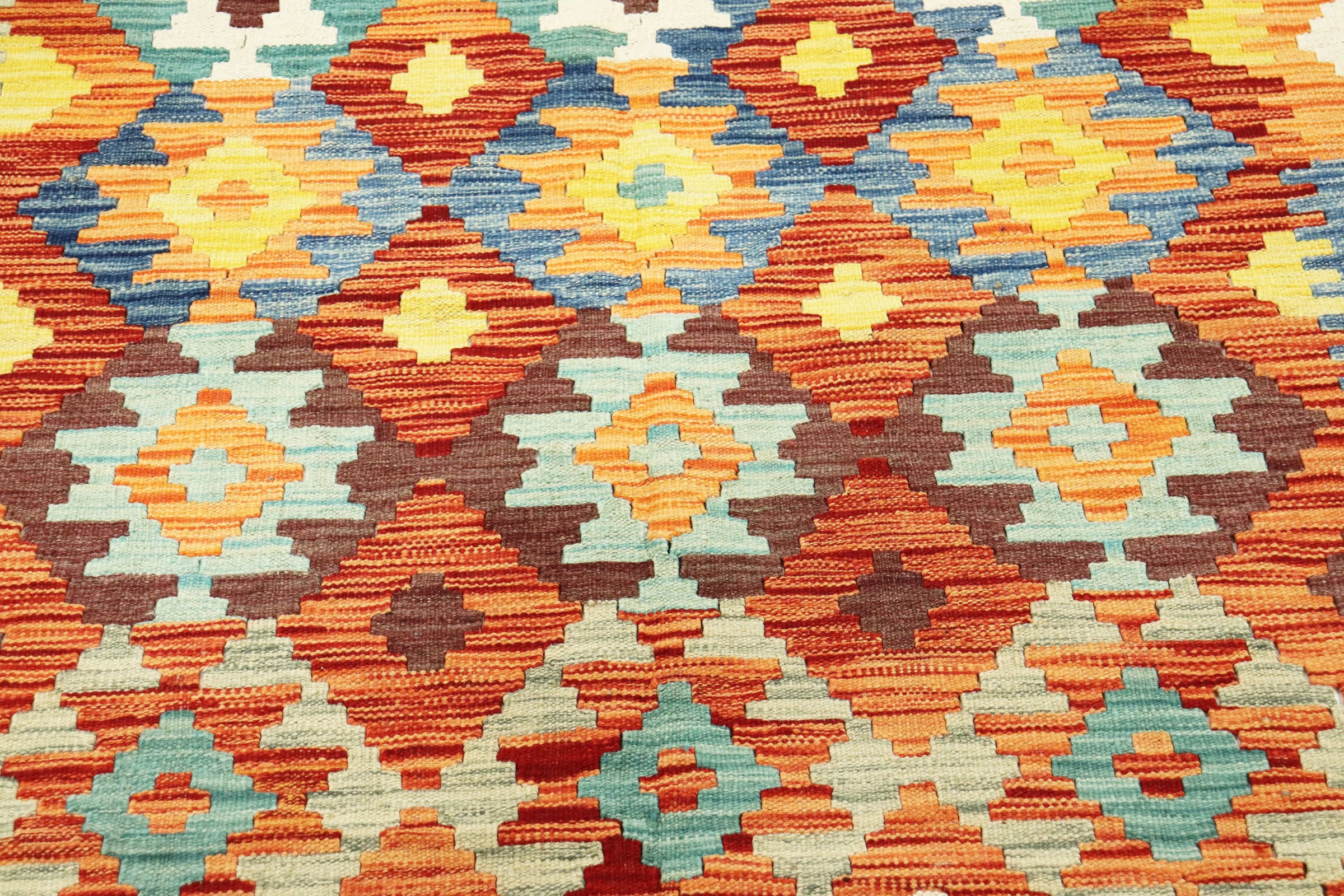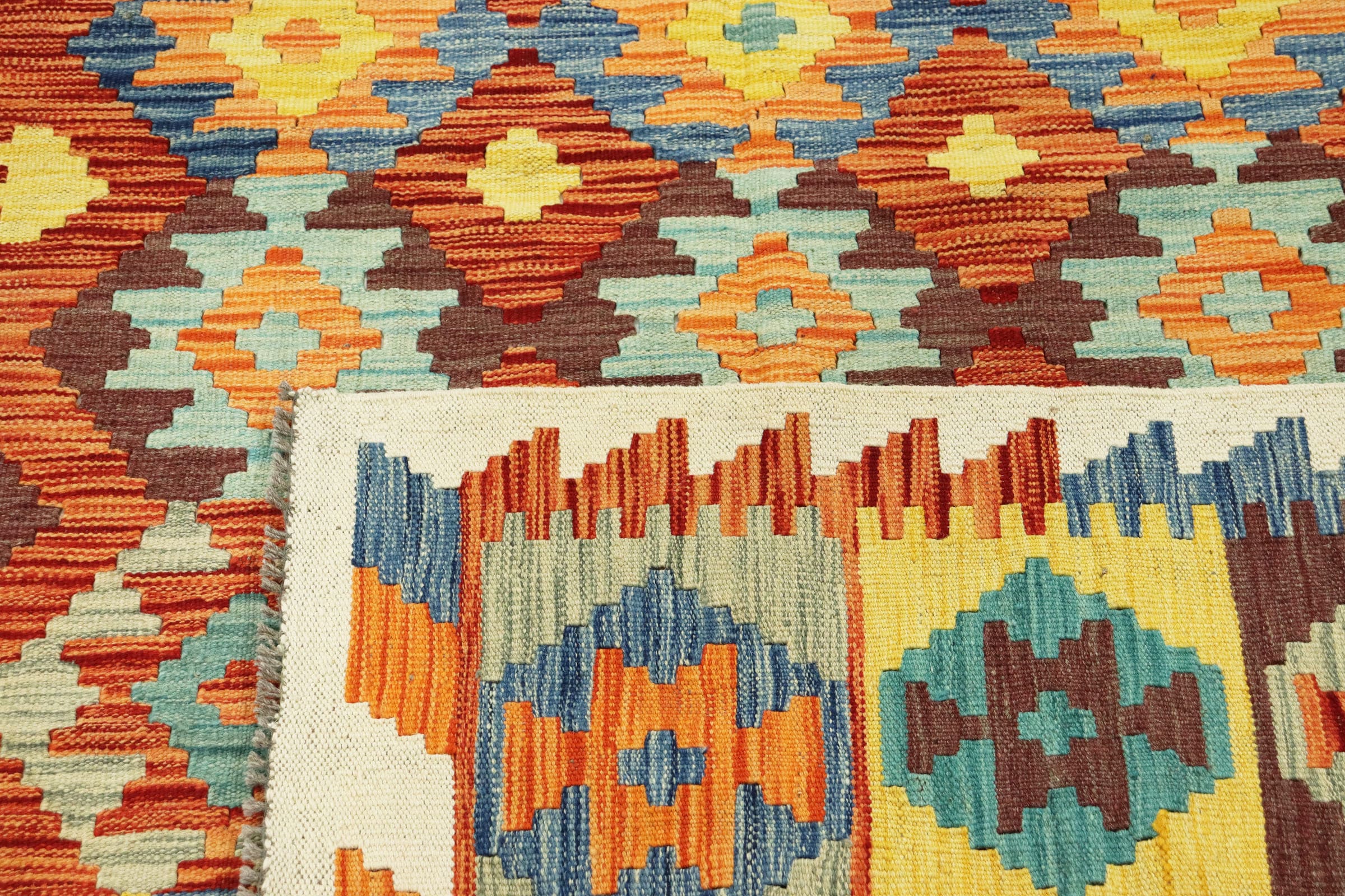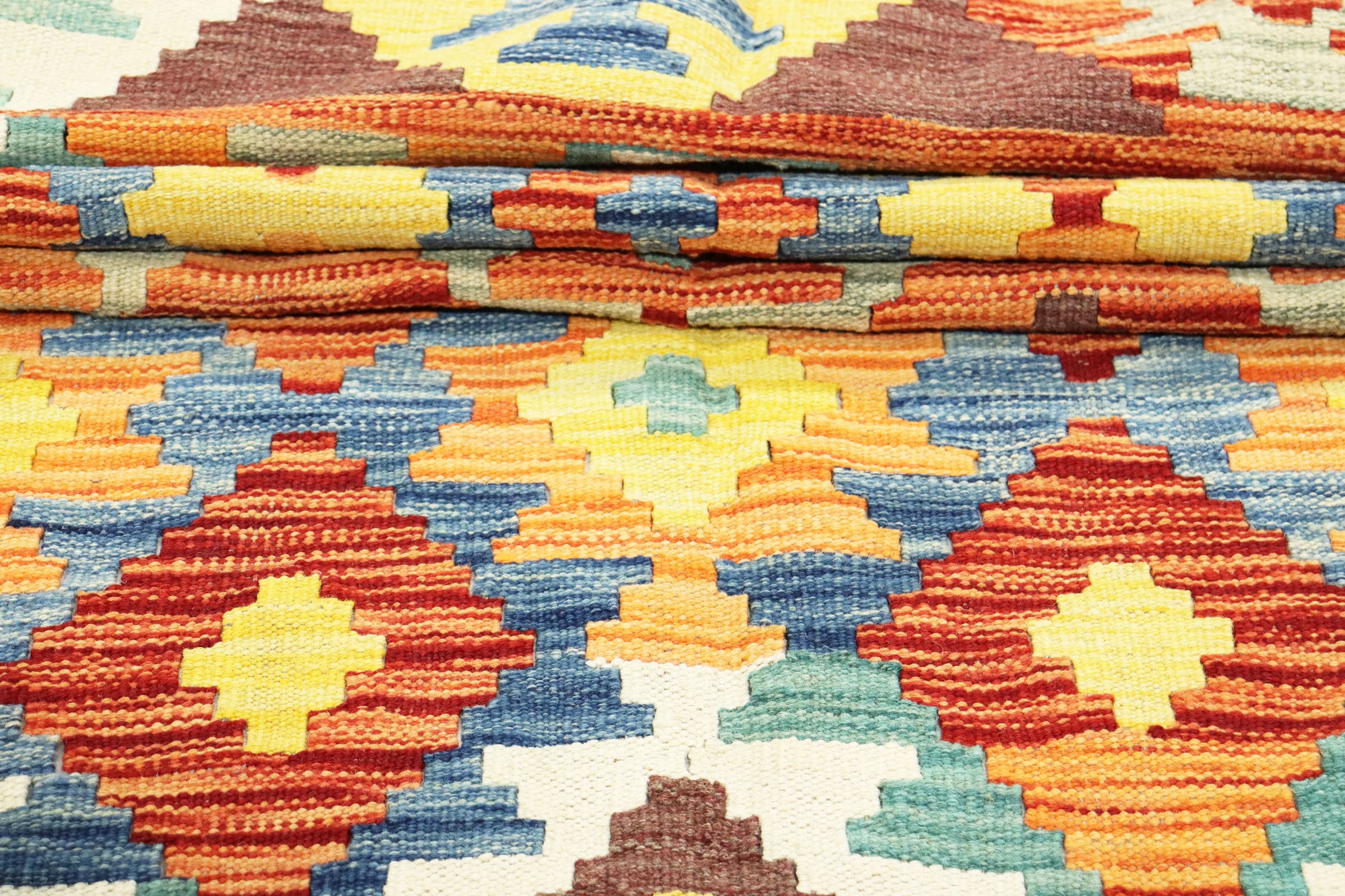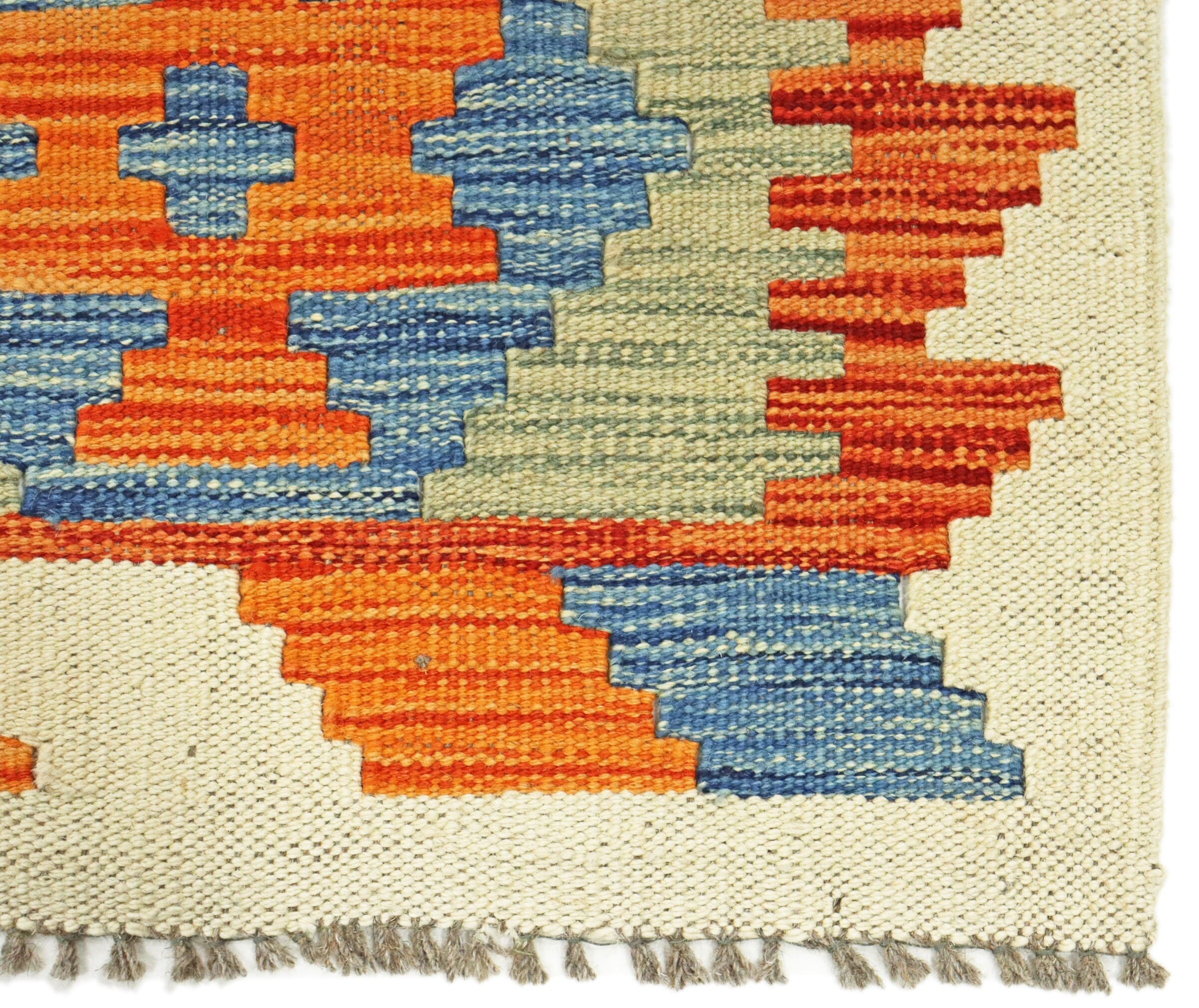 Dieser handgewebte Kelim-Teppich ist ein Kunstwerk aus naturbelassener Wolle. Die Besonderheit dieses Teppichs liegt darin, dass die Wolle von Hand gesponnen und mit natürlichen Pflanzenfarben veredelt wurde. Diese besonderen Exemplare, verwurzelt in alter Tradition, sind künstlerische Darstellungen, die die reiche kulturelle Vielfalt und das kunstvolle Handwerk des Orients eindrucksvoll zum Ausdruck bringen.