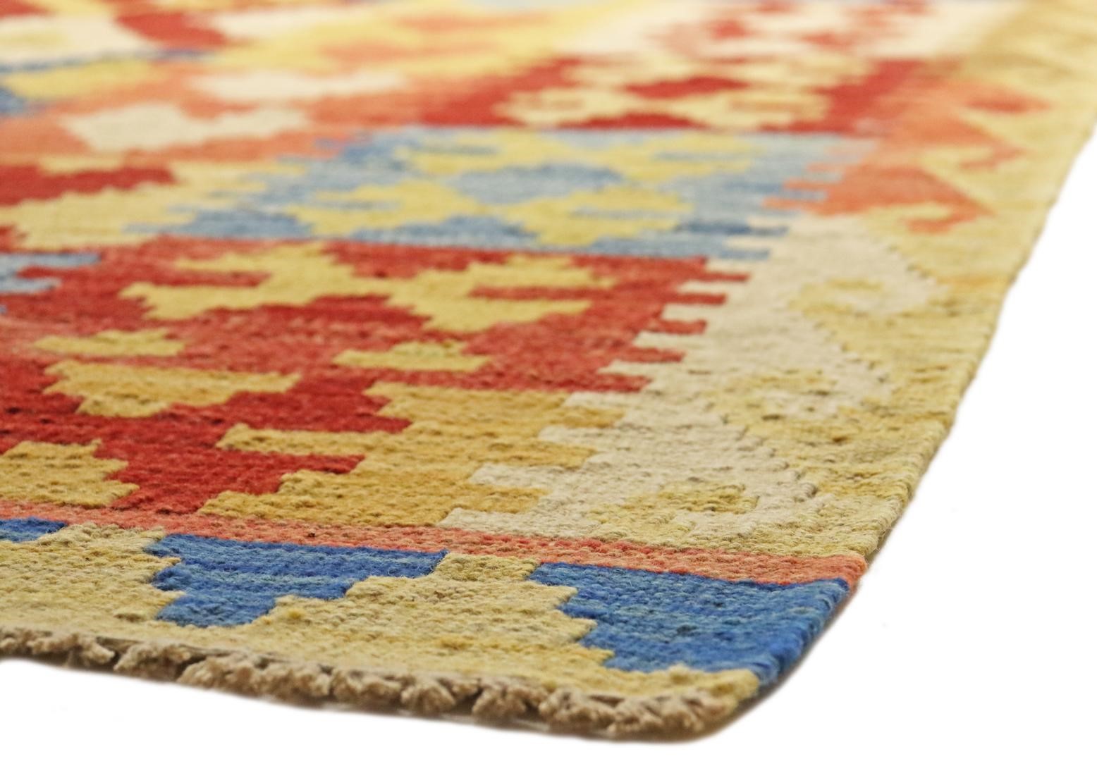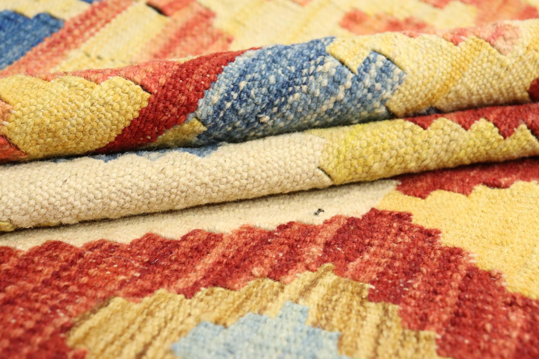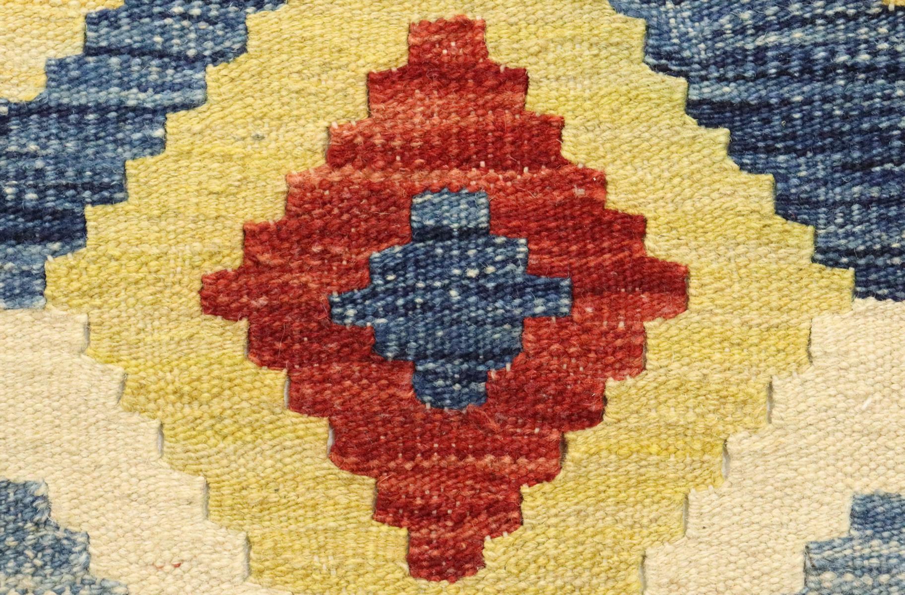 Dieser handgewebte Kelim-Teppich ist ein Kunstwerk aus naturbelassener Wolle. Die Besonderheit dieses Teppichs liegt darin, dass die Wolle von Hand gesponnen und mit natürlichen Pflanzenfarben veredelt wurde. Diese besonderen Exemplare, verwurzelt in alter Tradition, sind künstlerische Darstellungen, die die reiche kulturelle Vielfalt und das kunstvolle Handwerk des Orients eindrucksvoll zum Ausdruck bringen.