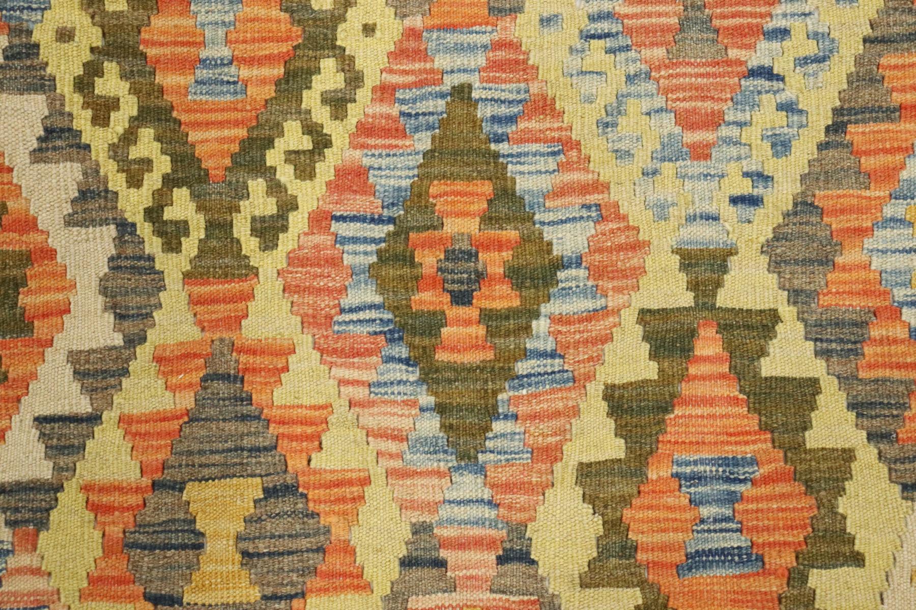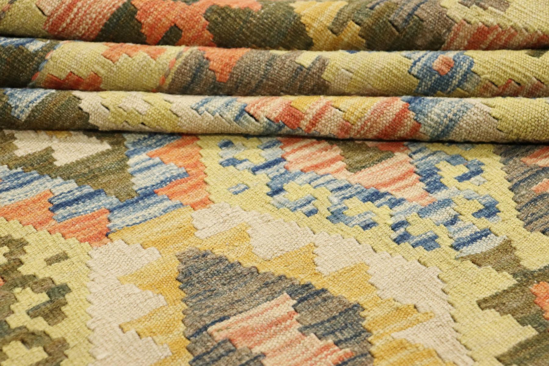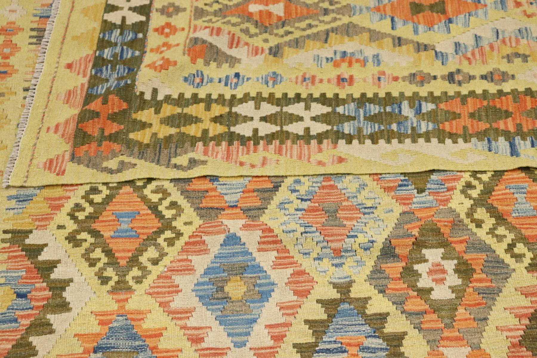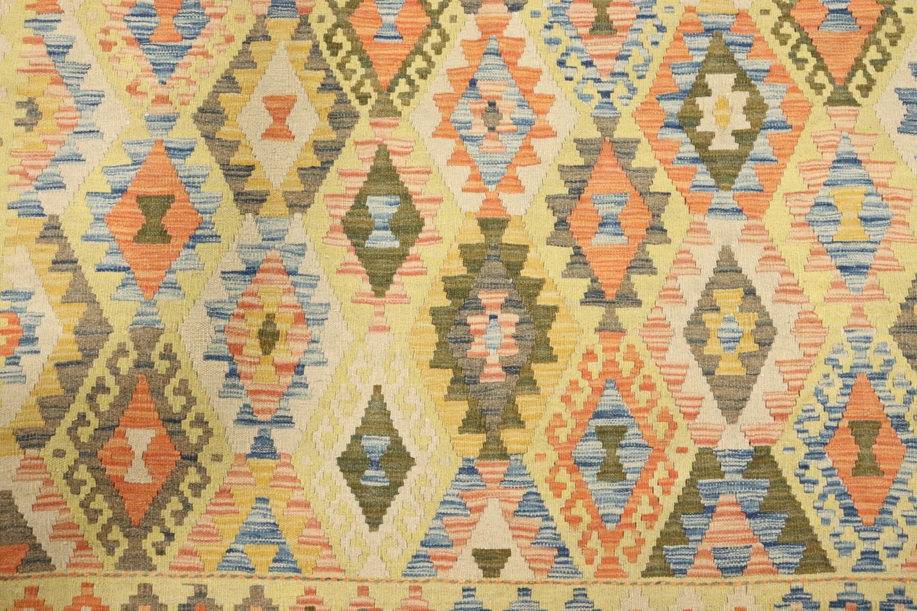 Dieser handgewebte Kelim-Teppich ist ein Kunstwerk aus naturbelassener Wolle. Die Besonderheit dieses Teppichs liegt darin, dass die Wolle von Hand gesponnen und mit natürlichen Pflanzenfarben veredelt wurde. Diese besonderen Exemplare, verwurzelt in alter Tradition, sind künstlerische Darstellungen, die die reiche kulturelle Vielfalt und das kunstvolle Handwerk des Orients eindrucksvoll zum Ausdruck bringen.