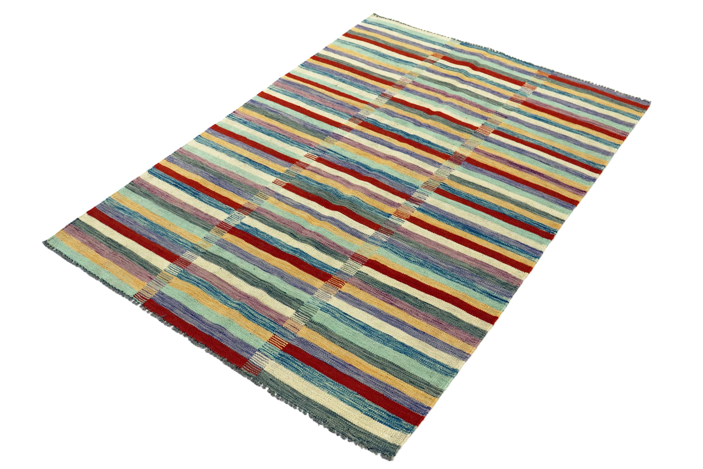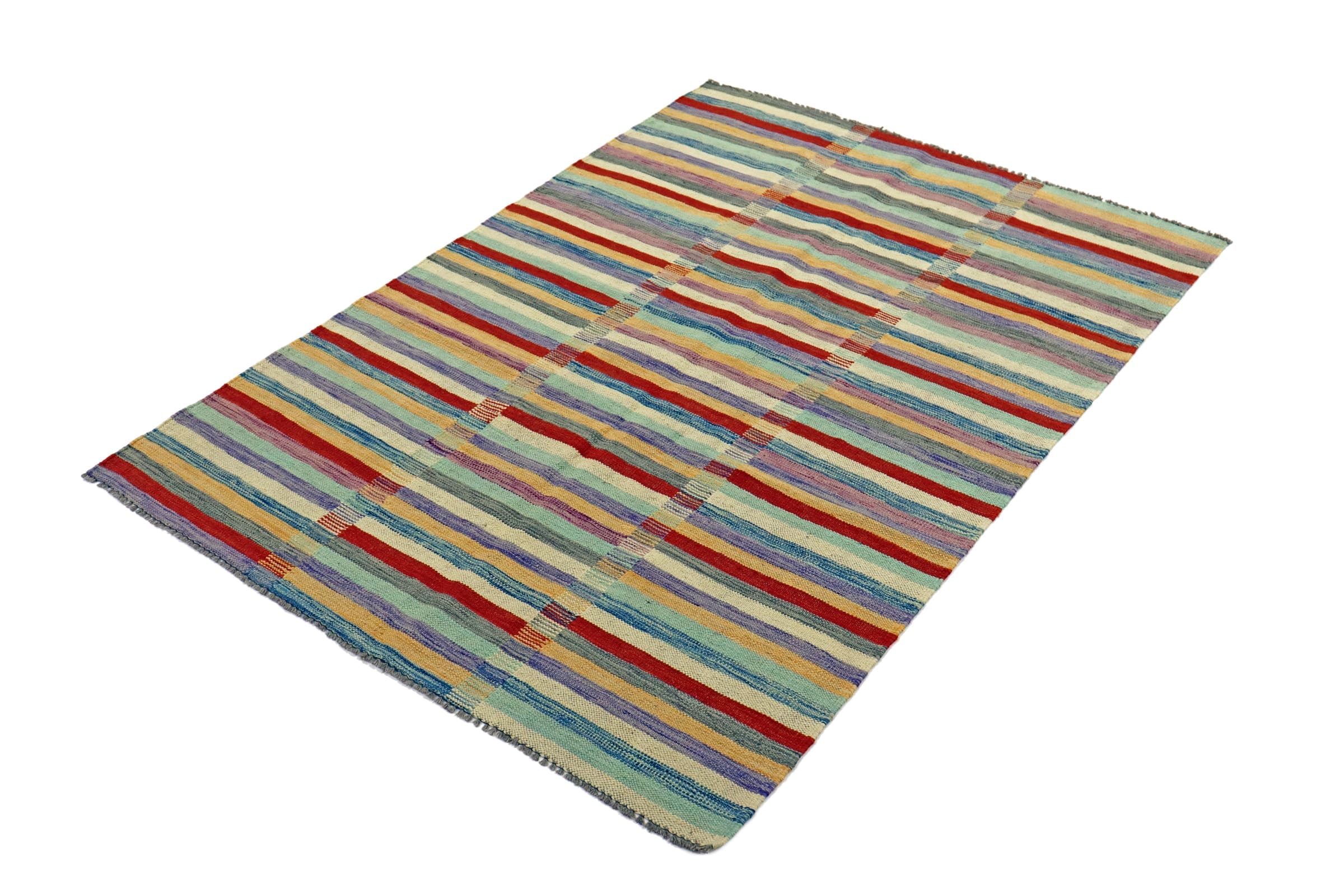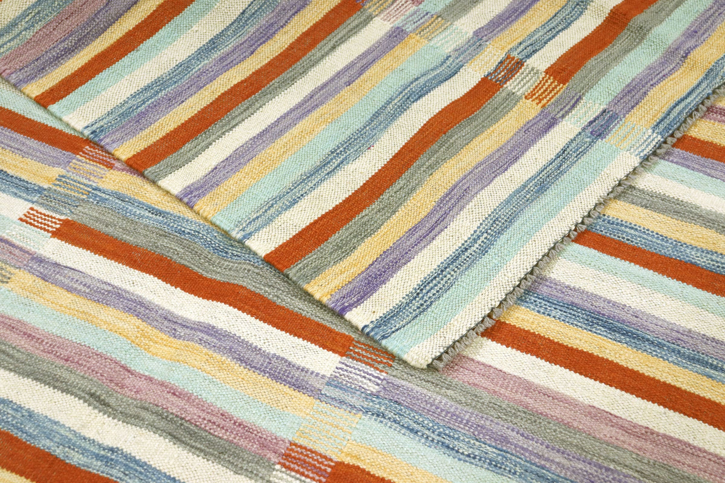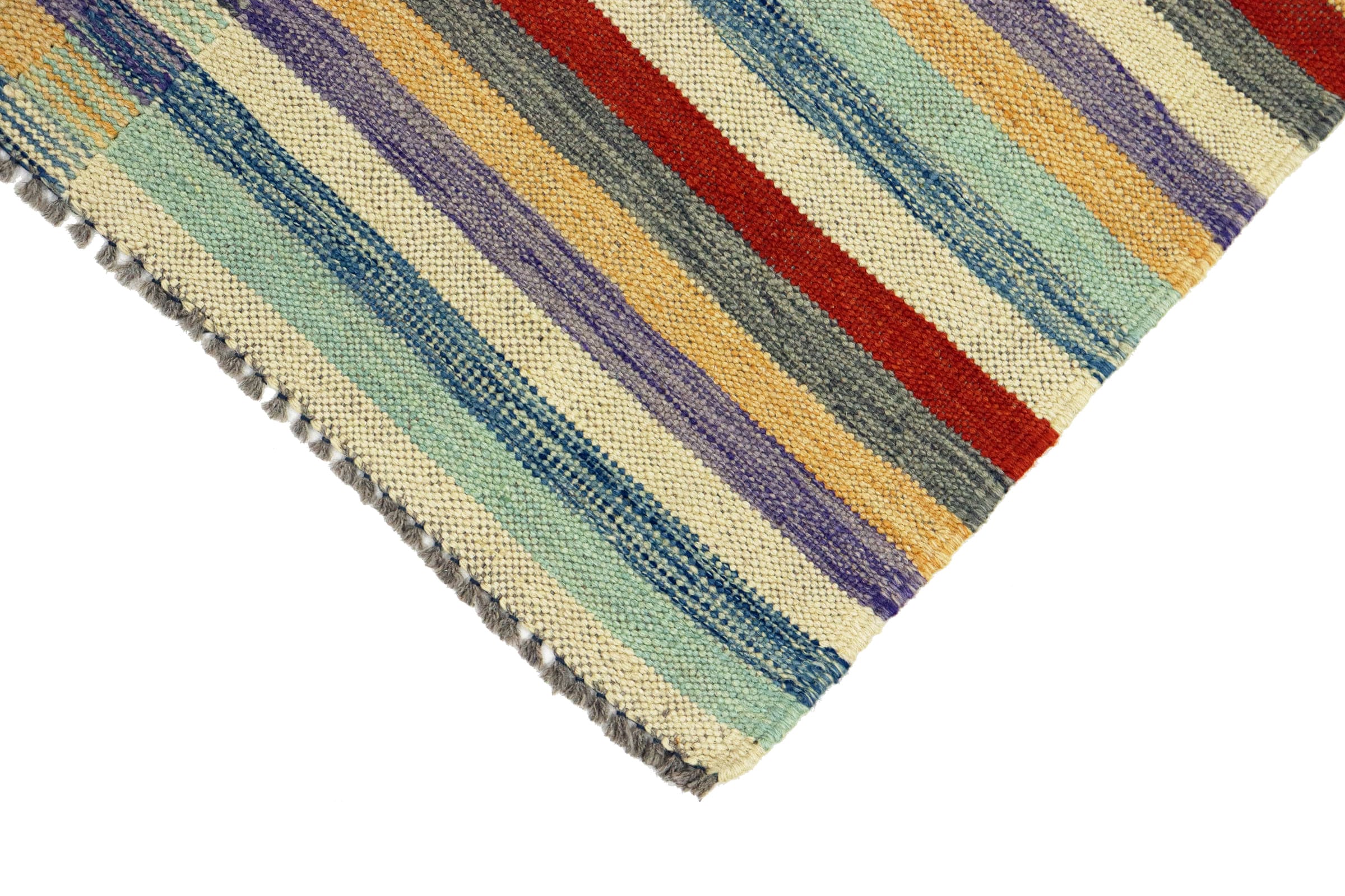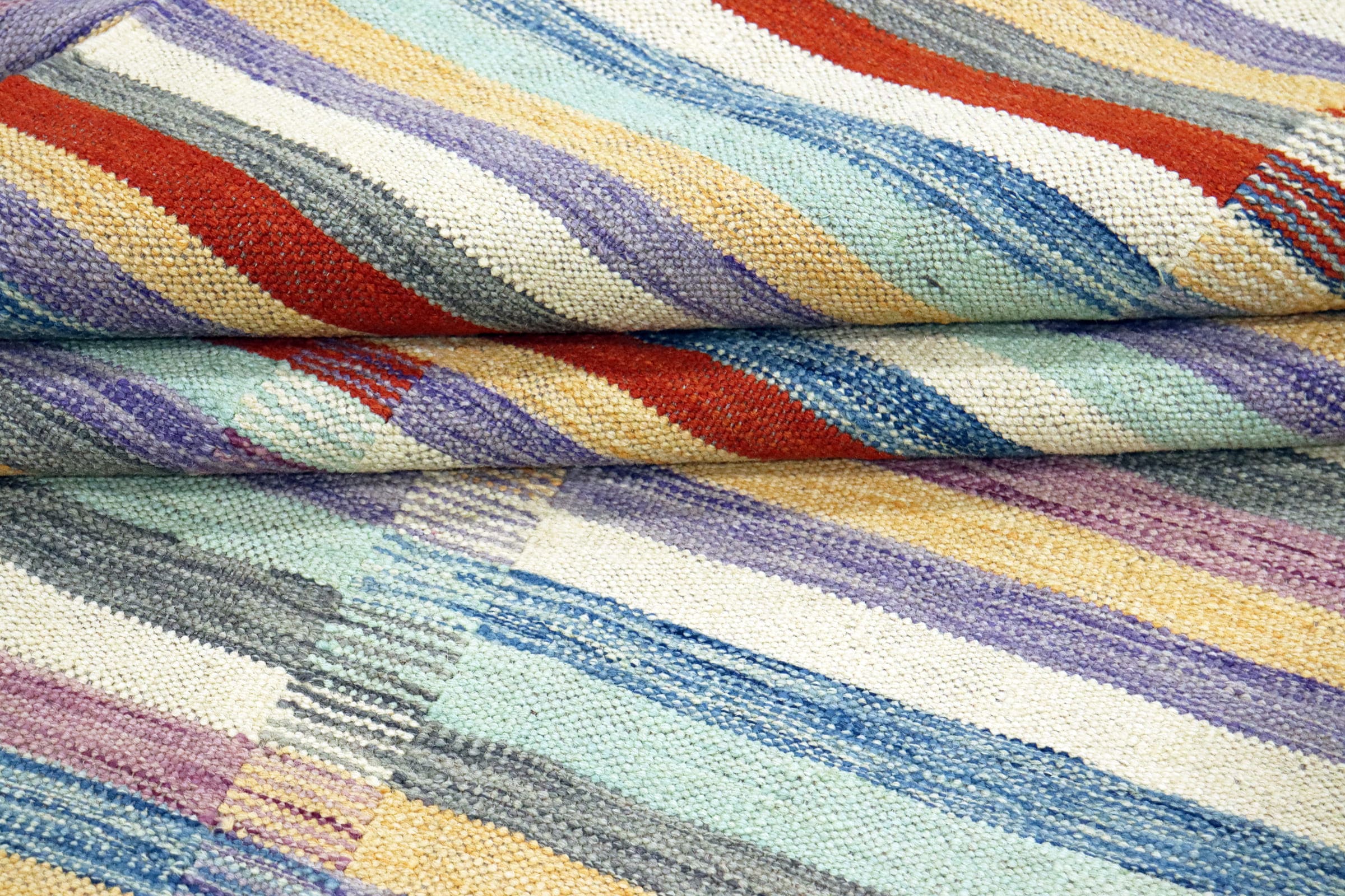 Ce tapis kilim tissé à la main présente un design contemporain unique et est une véritable œuvre d'art en pure laine naturelle. L'originalité de ce tapis réside dans la laine filée à la main et ennoblie avec des colorants végétaux naturels. Les motifs traditionnels des tapis orientaux fusionnent ici avec un design moderne exceptionnel.