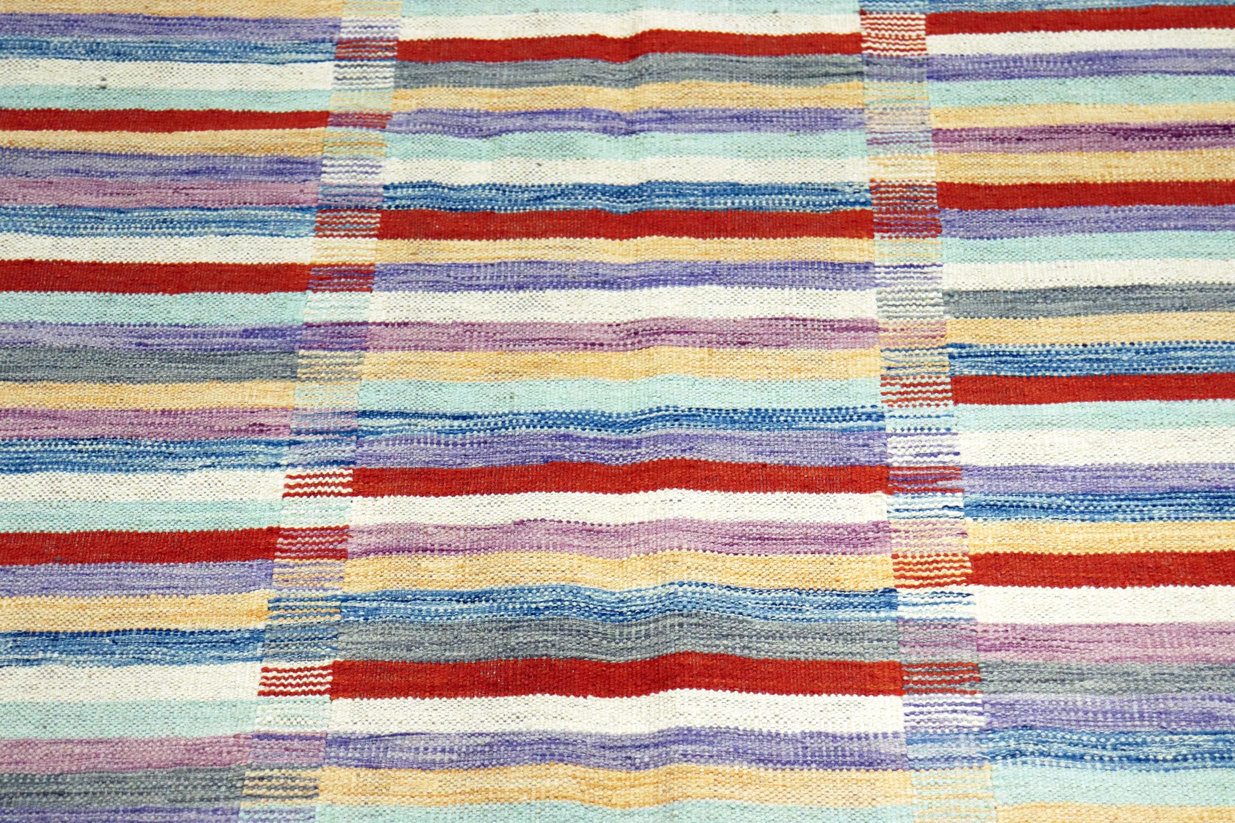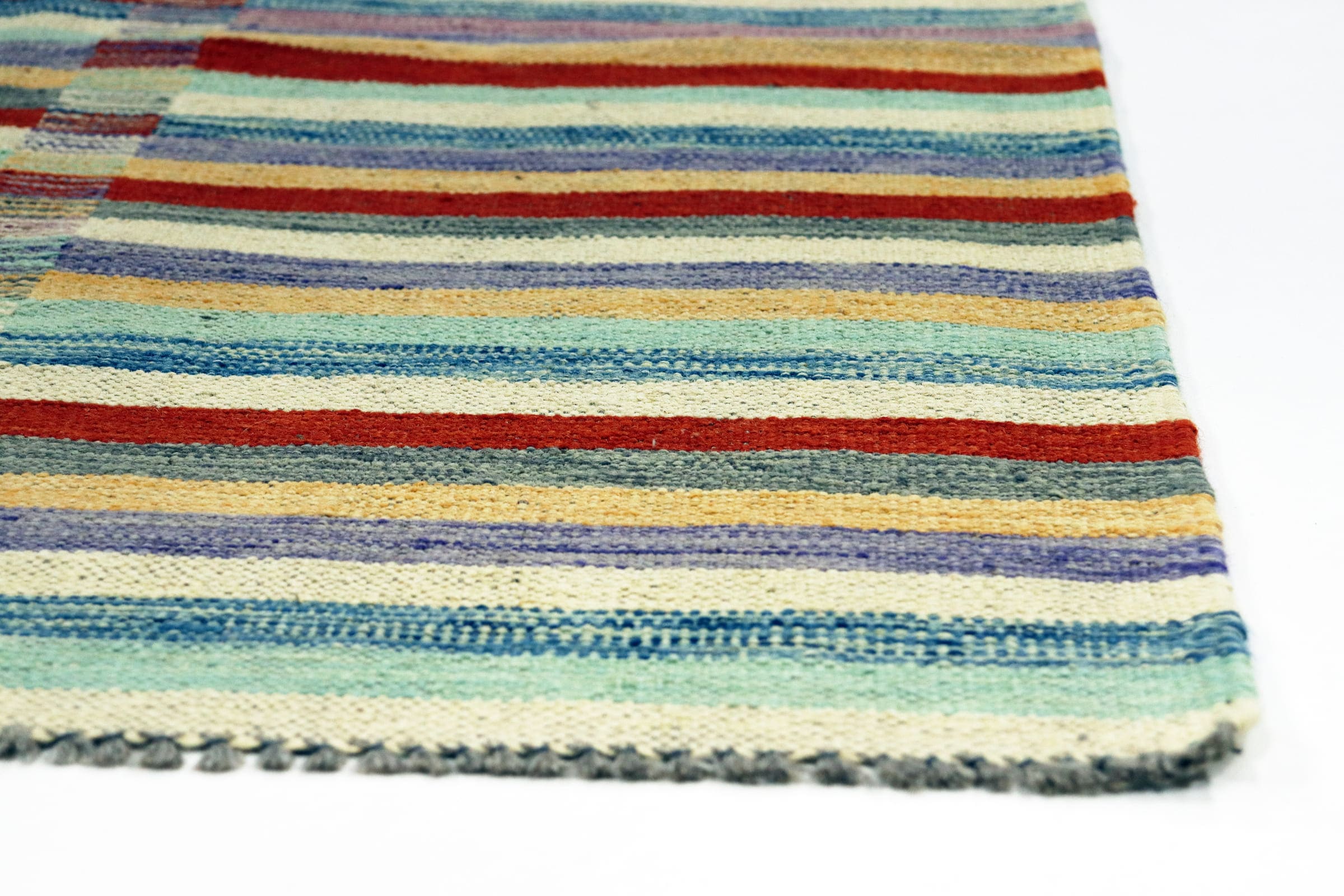 Ce tapis est un tapis tissé à plat, fabriqué à la main sur des métiers à tisser au lieu d'être fabriqué à la machine. Contrairement aux tapis traditionnels à poils longs, les tapis tissés à plat n'ont pas de fibres de poils épaisses et sont plutôt tissés à plat ou très à plat. Ce type de tapis est souvent apprécié pour sa polyvalence et son aspect fin et moderne. Les tapis tissés à plat sont un choix populaire pour ceux qui recherchent un revêtement de sol durable et élégant qui s'adapte à différents styles d'intérieur.