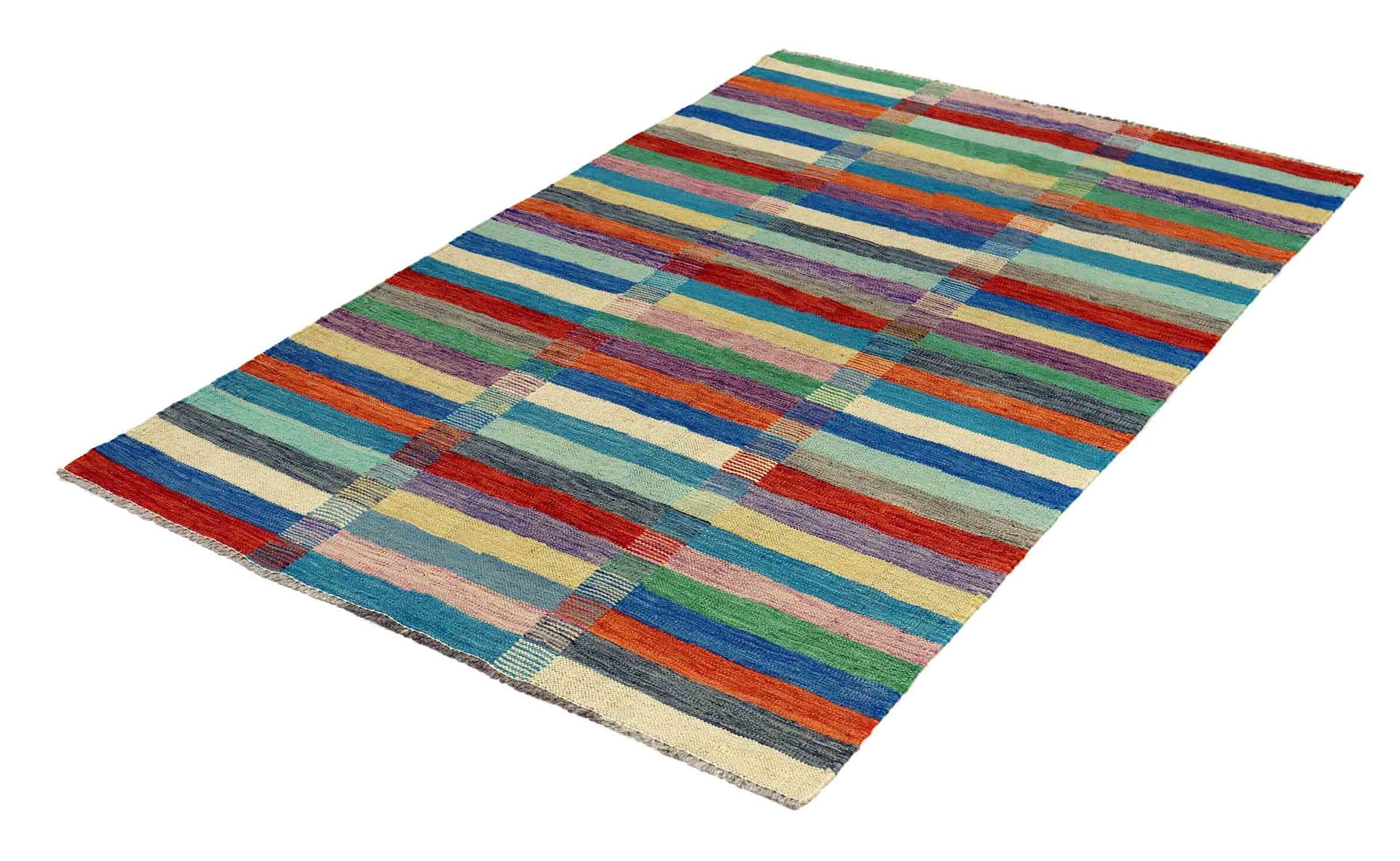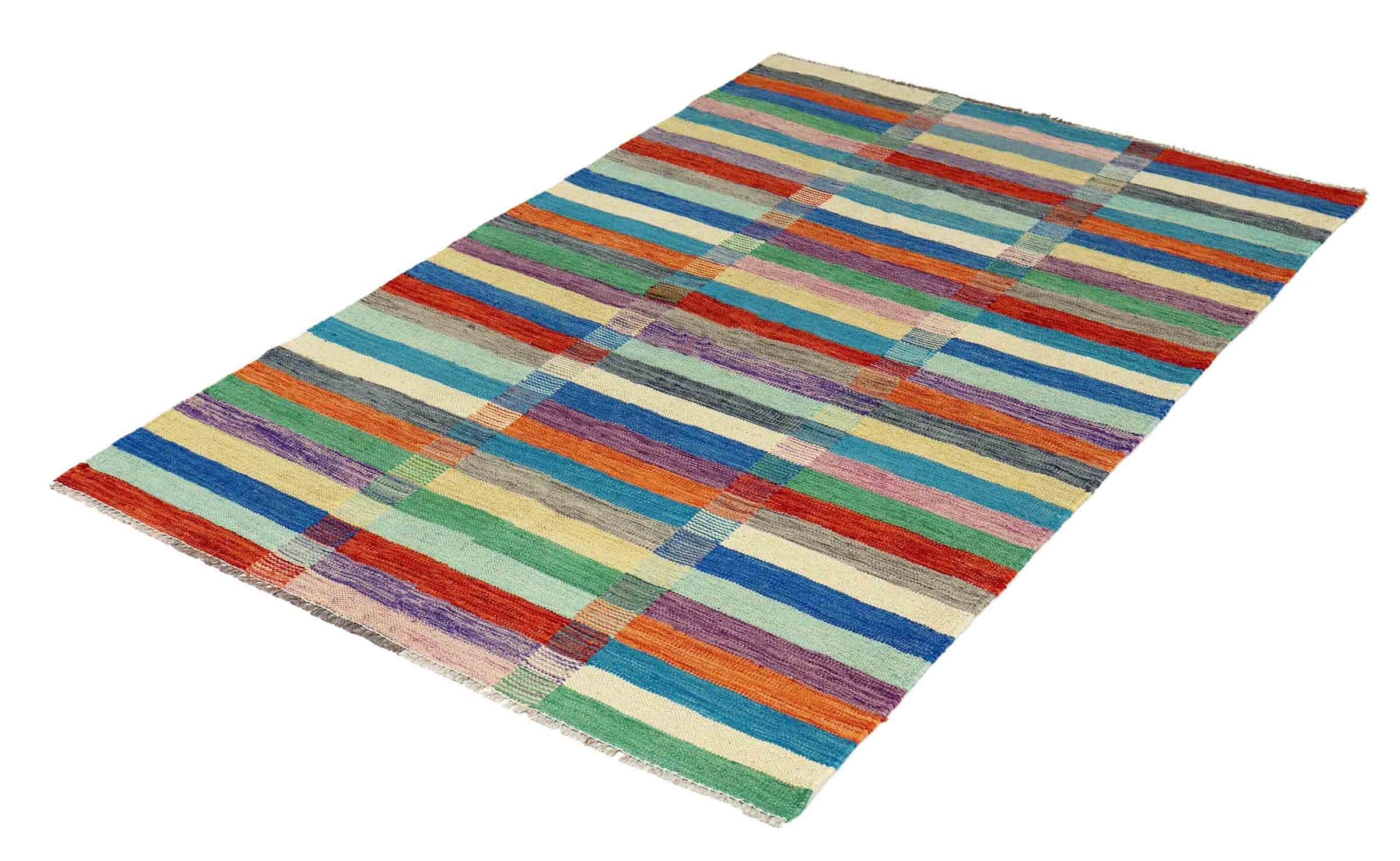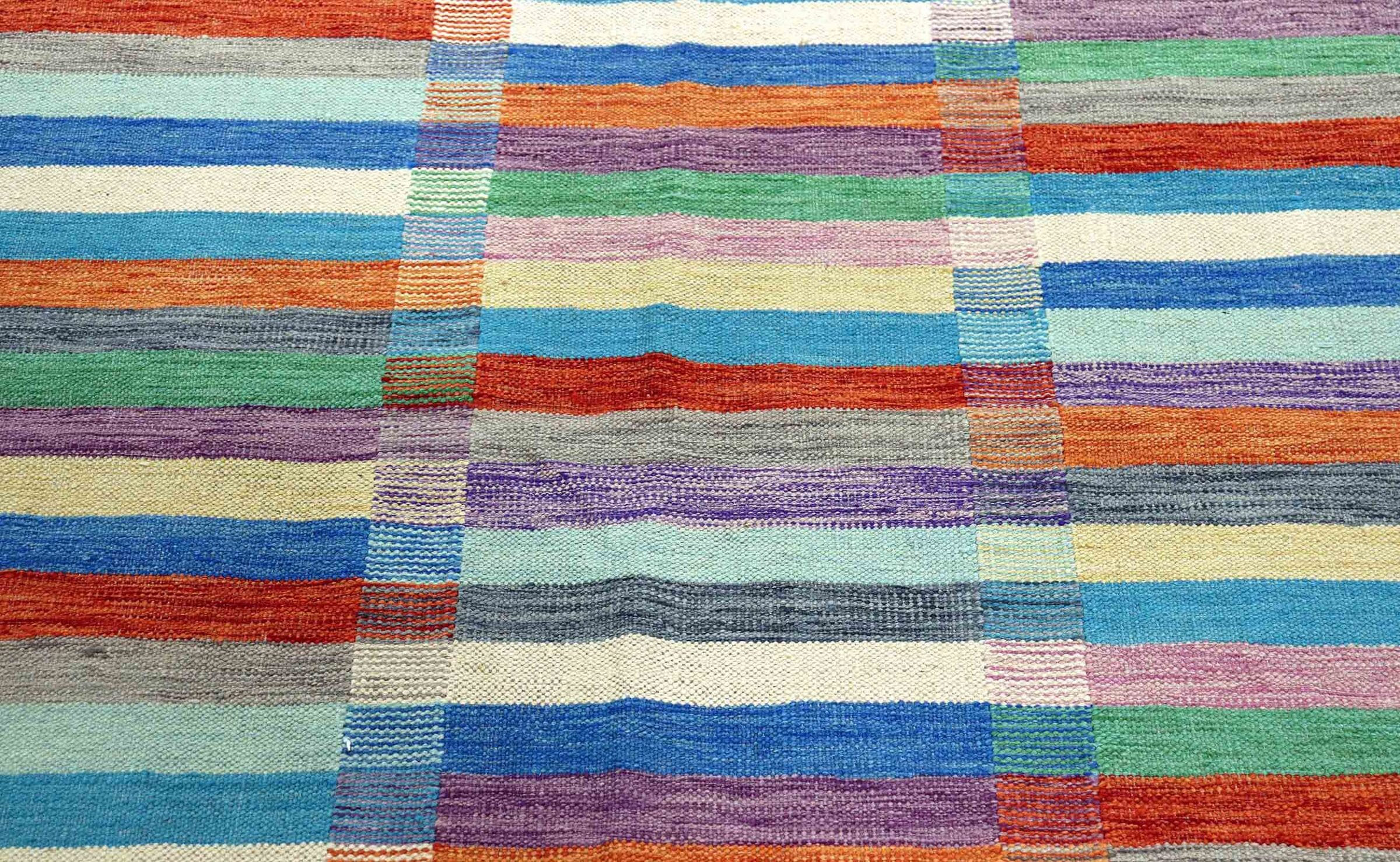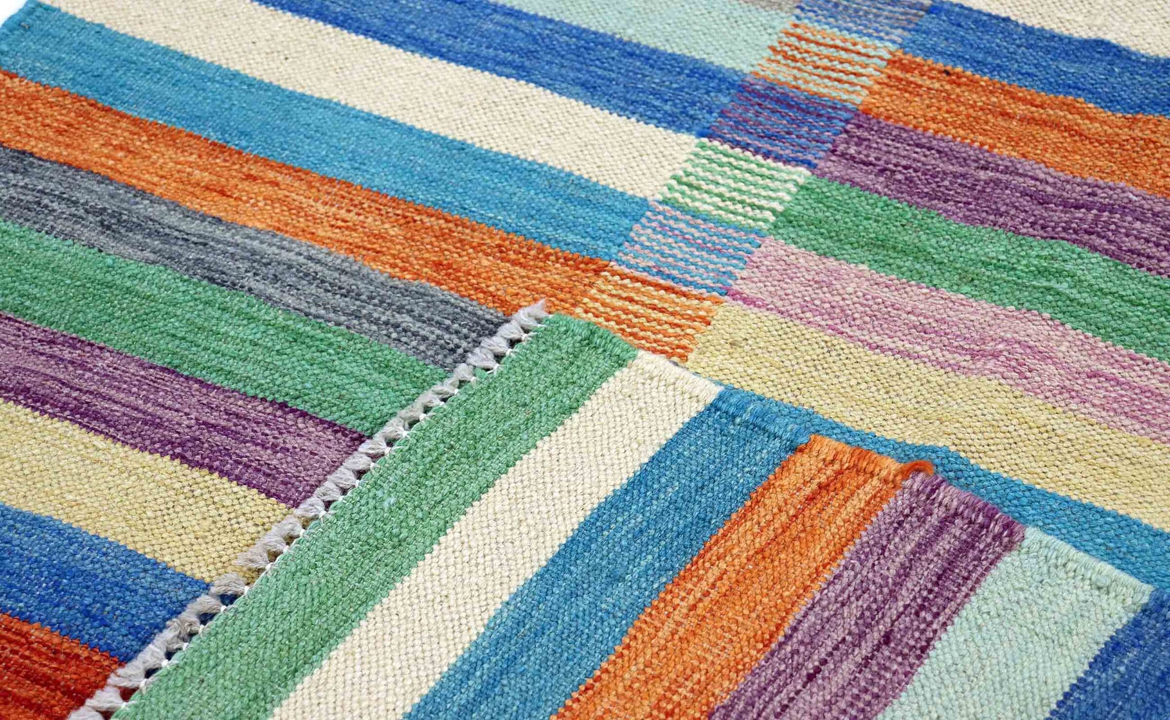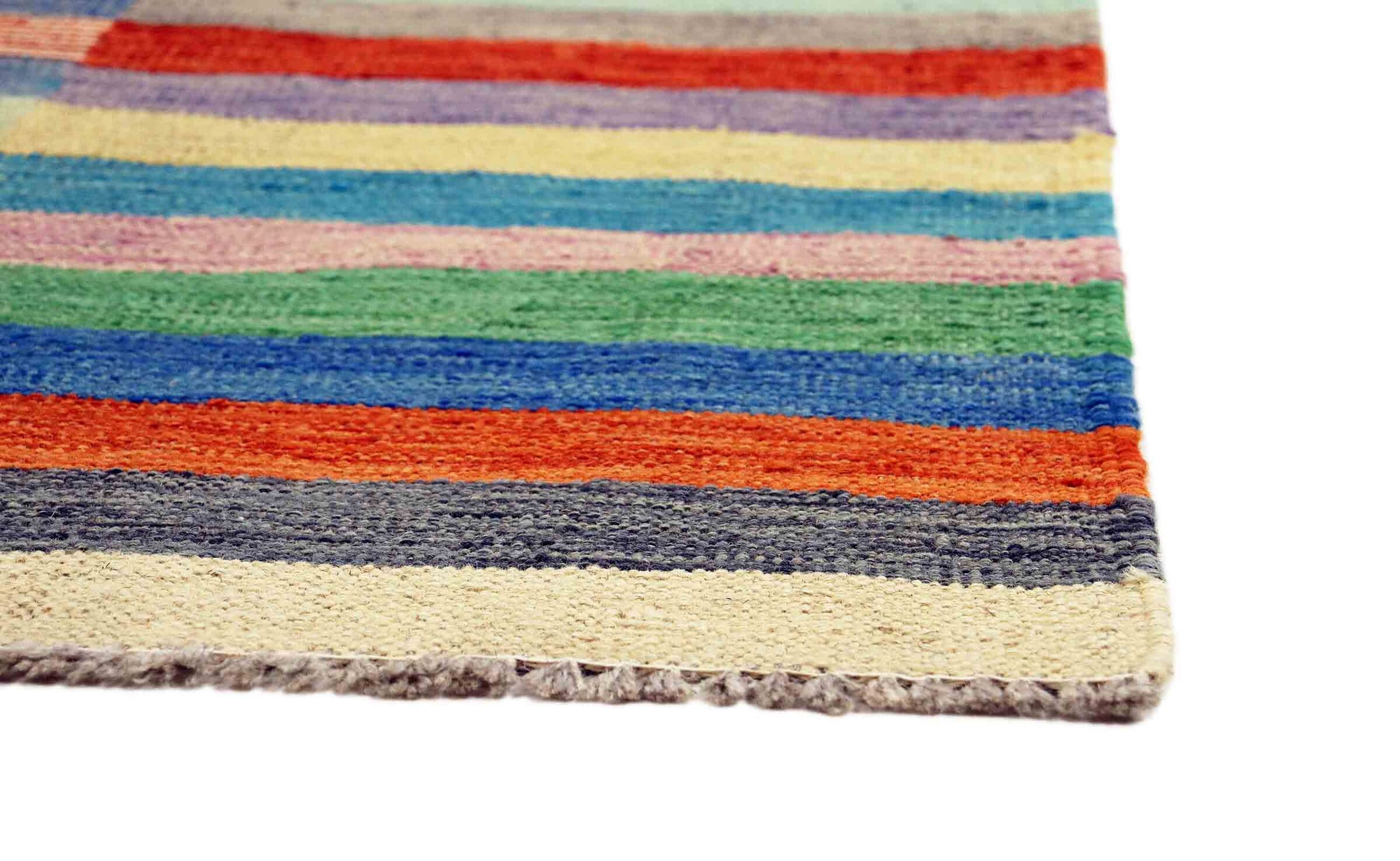 Ce tapis kilim tissé à la main présente un design contemporain unique et est une véritable œuvre d'art en pure laine naturelle. L'originalité de ce tapis réside dans la laine filée à la main et ennoblie avec des colorants végétaux naturels. Les motifs traditionnels des tapis orientaux fusionnent ici avec un design moderne exceptionnel.