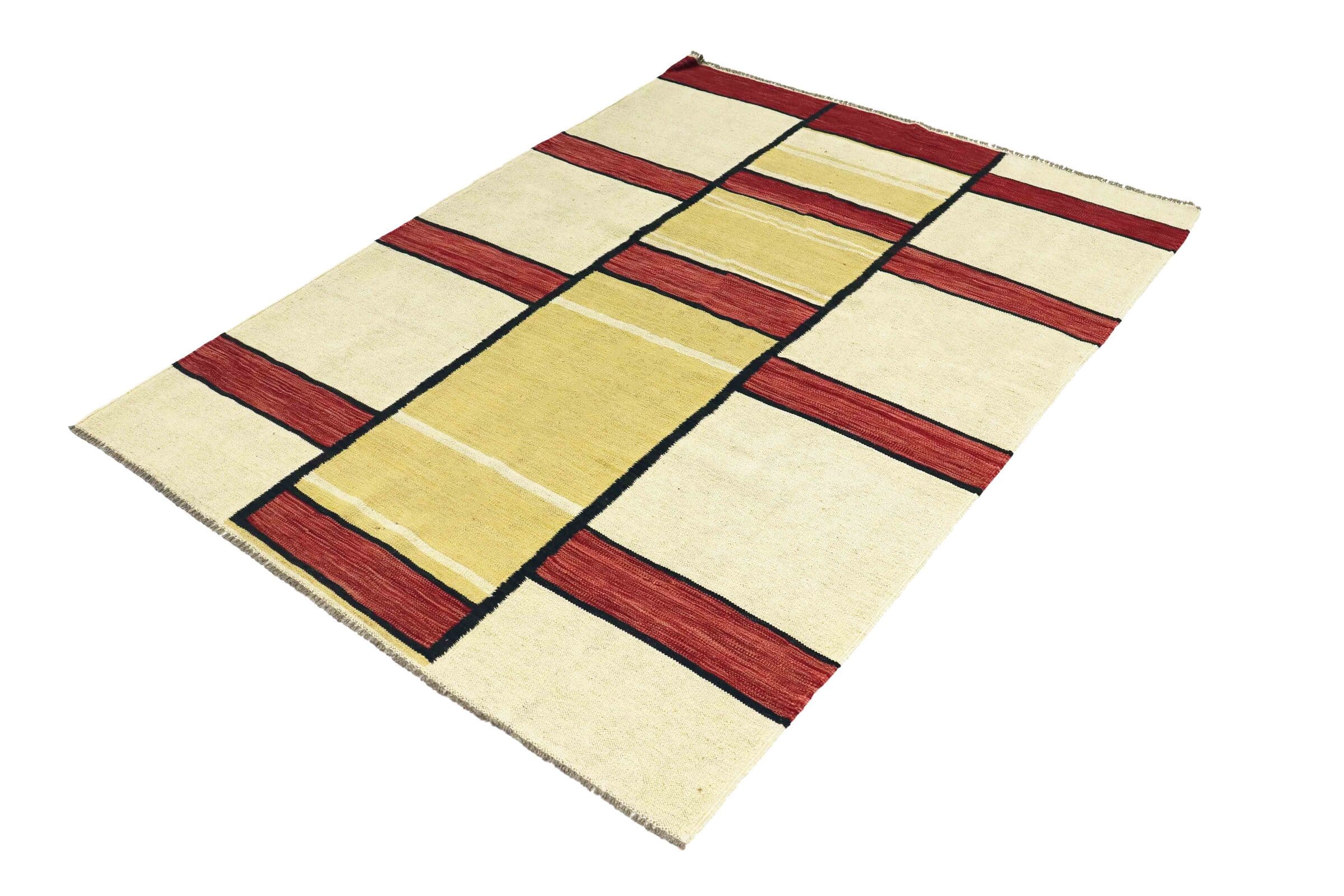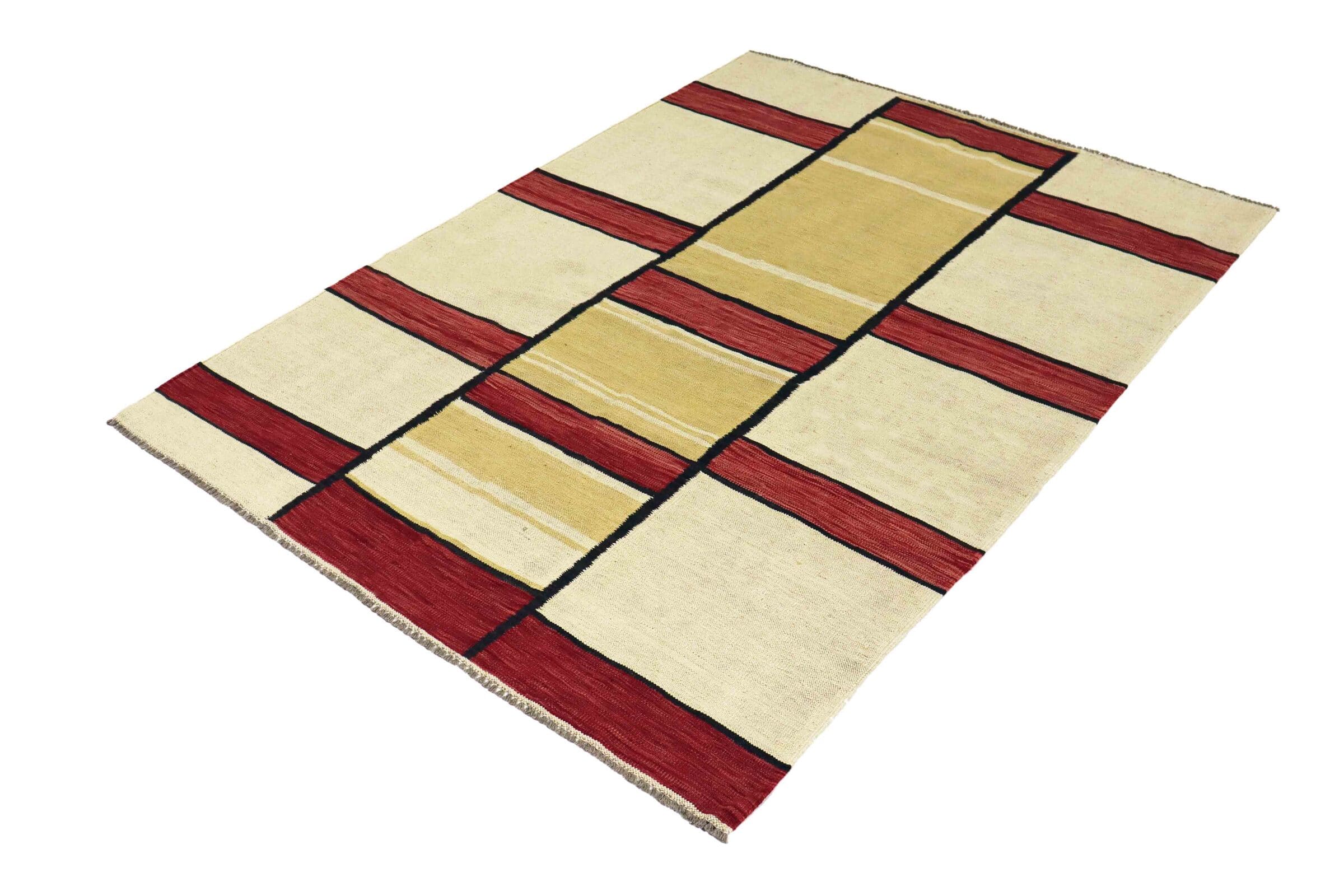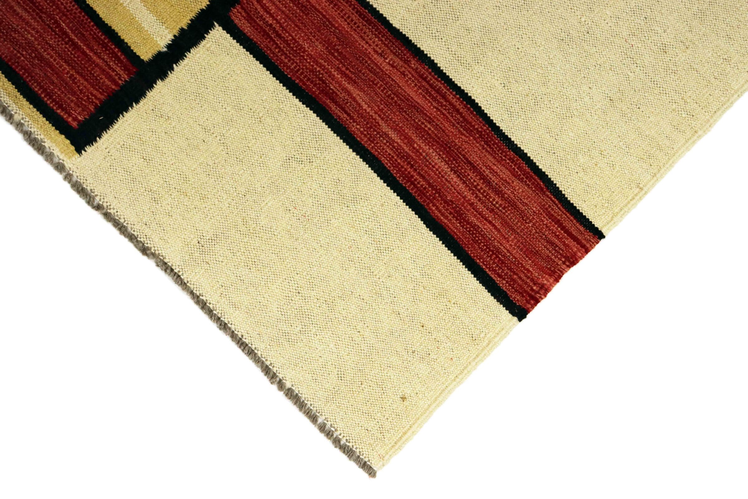 Ce tapis kilim tissé à la main présente un design contemporain unique et est une véritable œuvre d'art en pure laine naturelle. L'originalité de ce tapis réside dans la laine filée à la main et ennoblie avec des colorants végétaux naturels. Les motifs traditionnels des tapis orientaux fusionnent ici avec un design moderne exceptionnel.