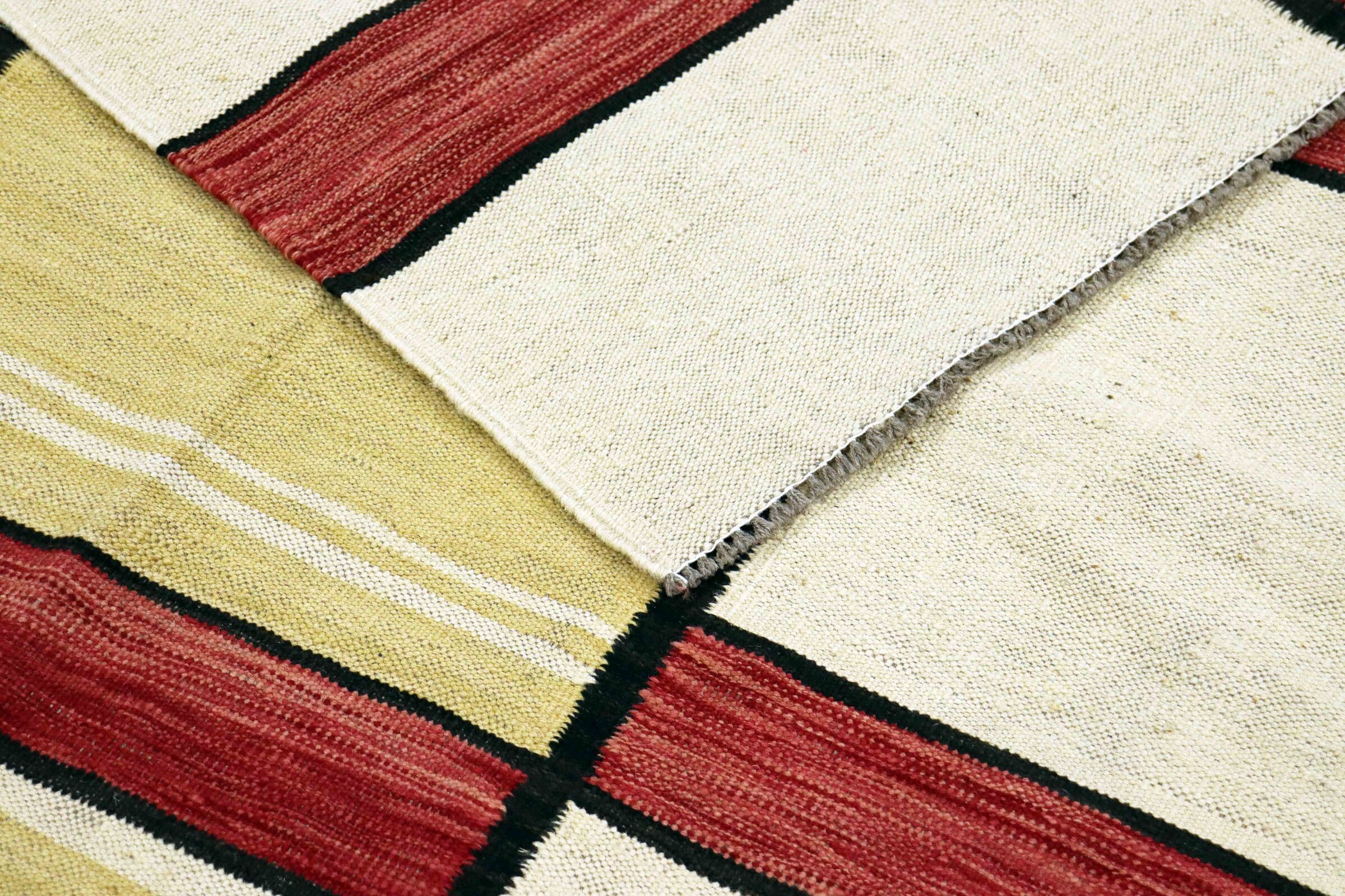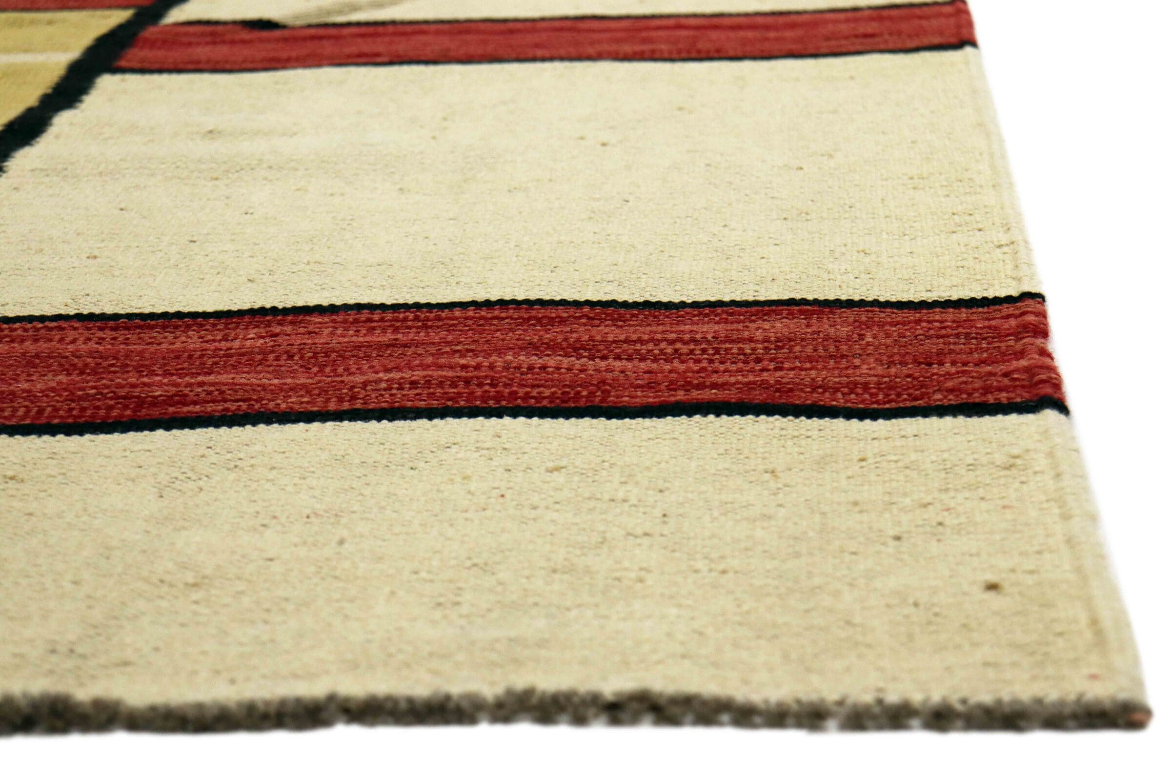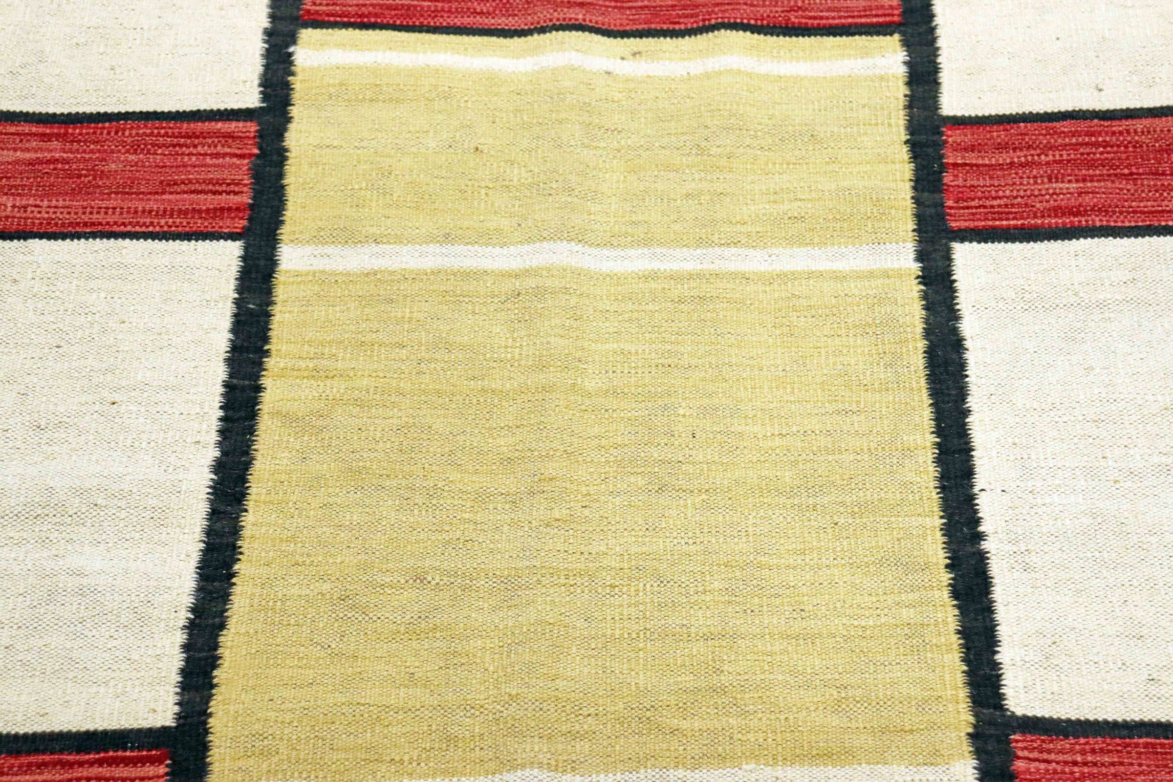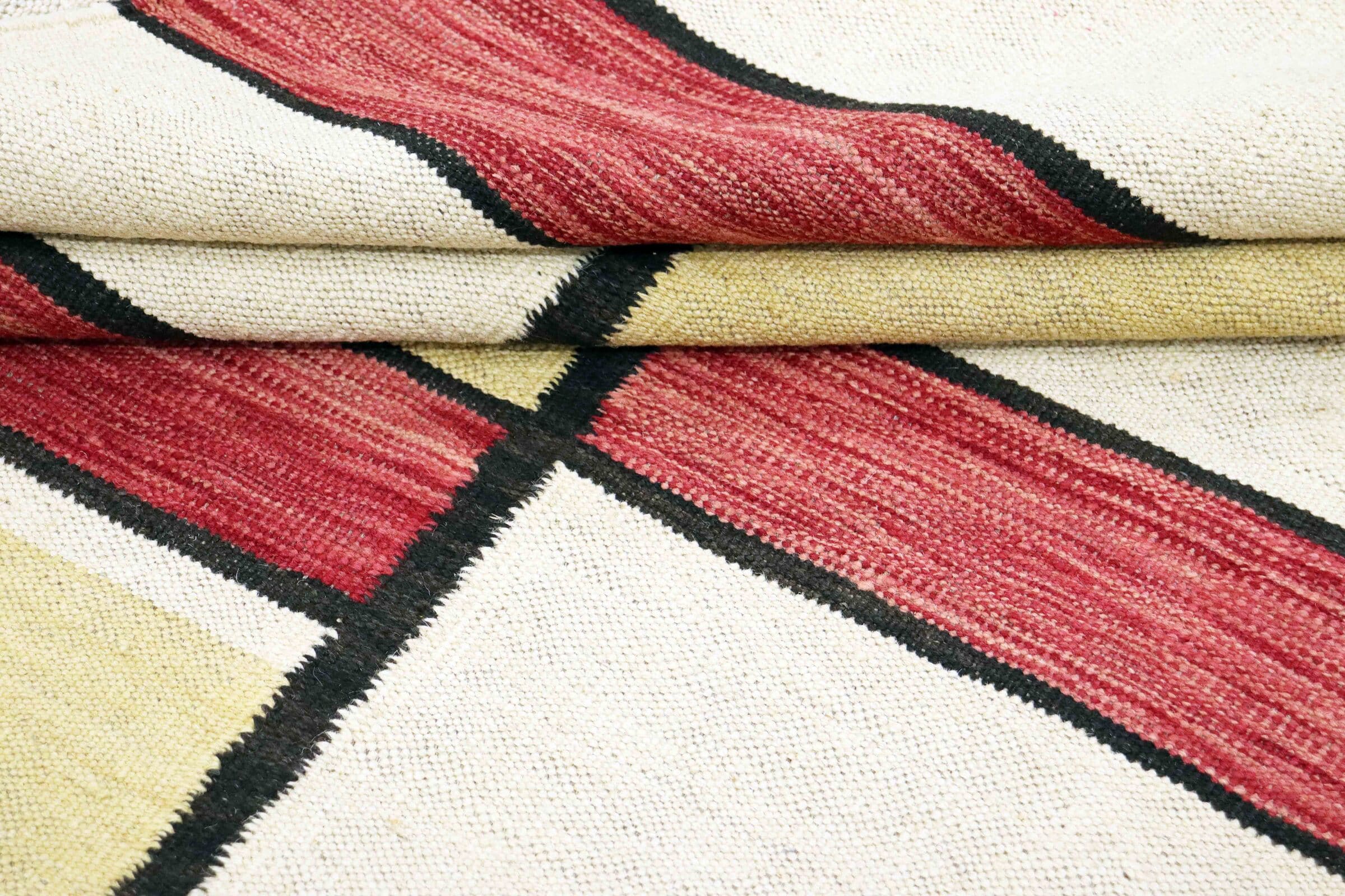 Ce tapis est un tapis tissé à plat, fabriqué à la main sur des métiers à tisser au lieu d'être fabriqué à la machine. Contrairement aux tapis traditionnels à poils longs, les tapis tissés à plat n'ont pas de fibres de poils épaisses et sont plutôt tissés à plat ou très à plat. Ce type de tapis est souvent apprécié pour sa polyvalence et son aspect fin et moderne. Les tapis tissés à plat sont un choix populaire pour ceux qui recherchent un revêtement de sol durable et élégant qui s'adapte à différents styles d'intérieur.