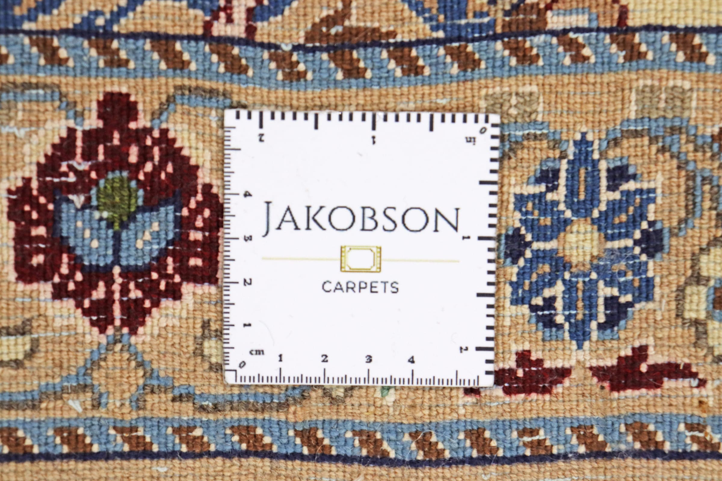 Ce tapis Naïn noué à la main représente la tradition séculaire du nouage de tapis. Chaque détail de cette œuvre d'art est le résultat d'un travail manuel méticuleux. Le processus de fabrication d'un tapis Naïn est extrêmement long et requiert une grande habileté artisanale. Ces tapis sont fabriqués sur des métiers à tisser spéciaux, où chaque nœud est noué à la main. Cette technique laborieuse confère au tapis non seulement son esthétique unique, mais aussi sa remarquable durabilité. La fabrication d'un tapis Naïn est un processus de longue haleine qui peut souvent durer des mois, voire des années. Les artisans investissent beaucoup de temps et de patience pour que chaque détail soit parfait. Le nombre de nœuds par mètre carré est un facteur décisif pour la qualité et la valeur d'un tapis Naïn. Plus la densité de nœuds est élevée, plus le tapis est élaboré et précieux.