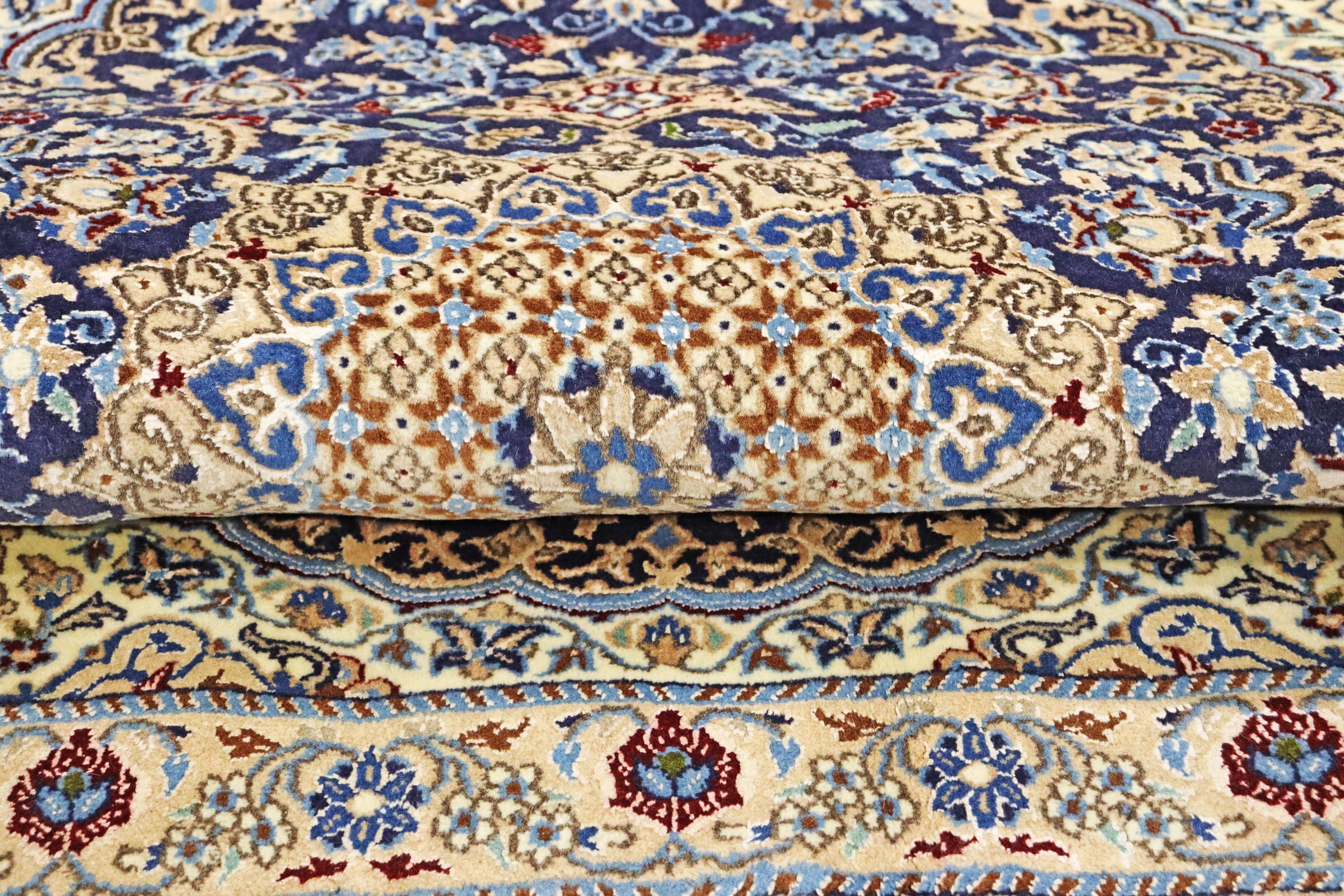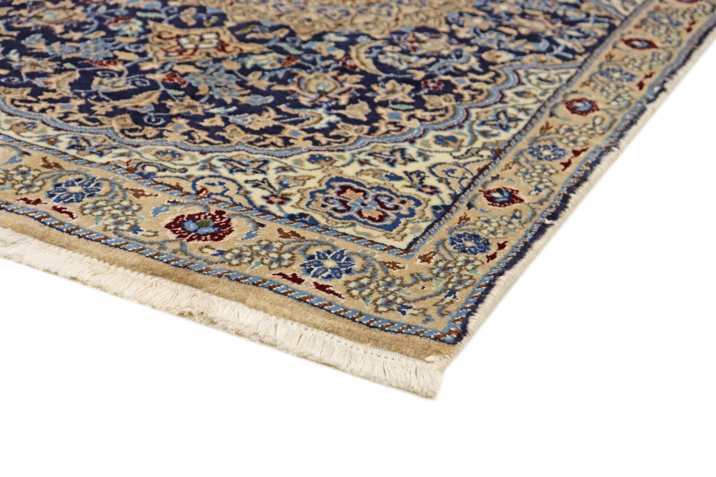 Die Knüpfer aus Nain, die am westlichen Rand der Wüste Dascht-e-Kavir arbeiten, fertigen diesen Nain Kaschmar-Teppich von Hand aus hochwertiger Wolle und Naturseide. Mit einer Klassifizierung von 12La weist dieser Teppich zwar nicht die gleiche Detailtreue wie ein 9La auf, doch dank seines dicken Flors präsentiert er ein besonders weiches Gewebe und schafft somit eine gemütliche Atmosphäre.