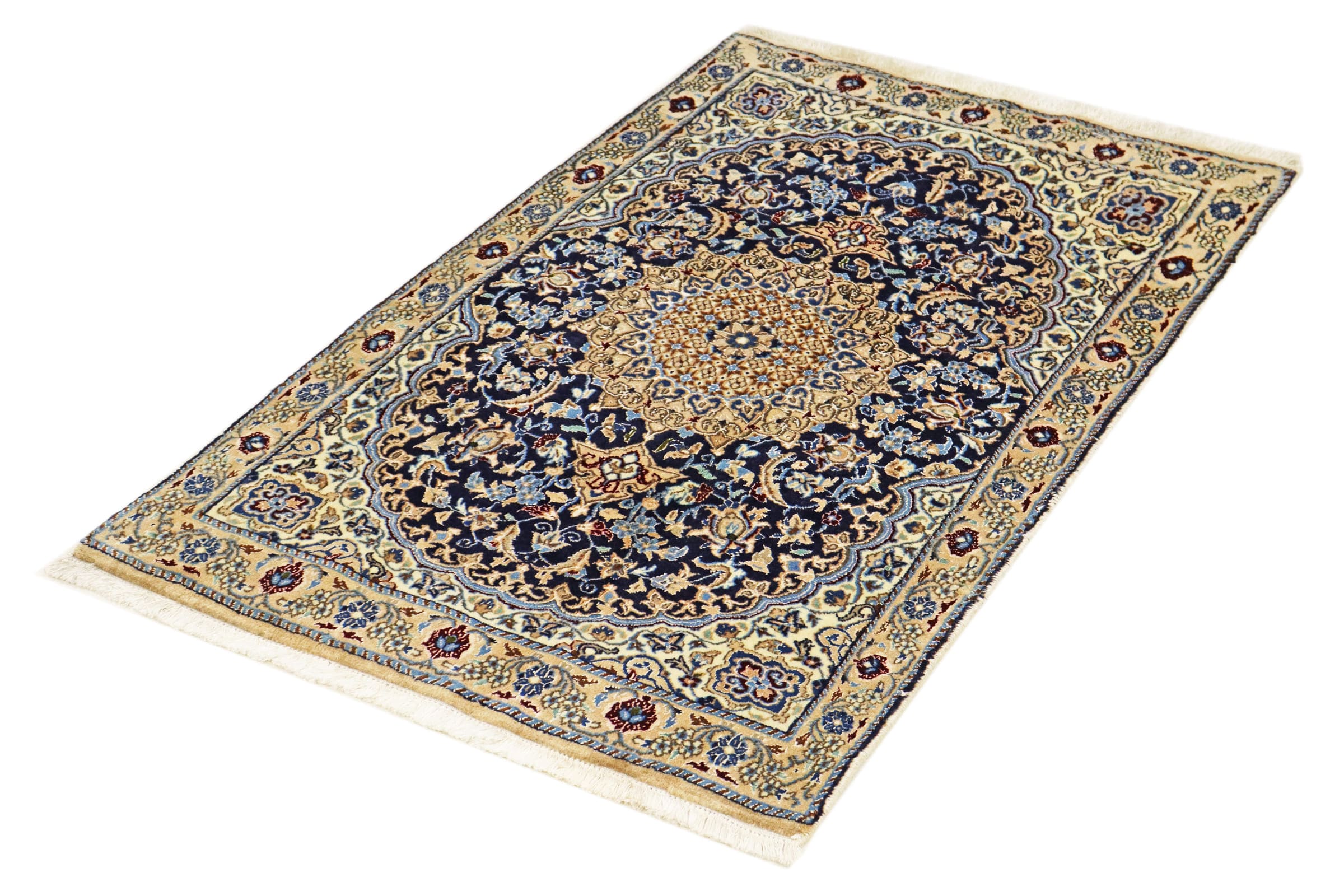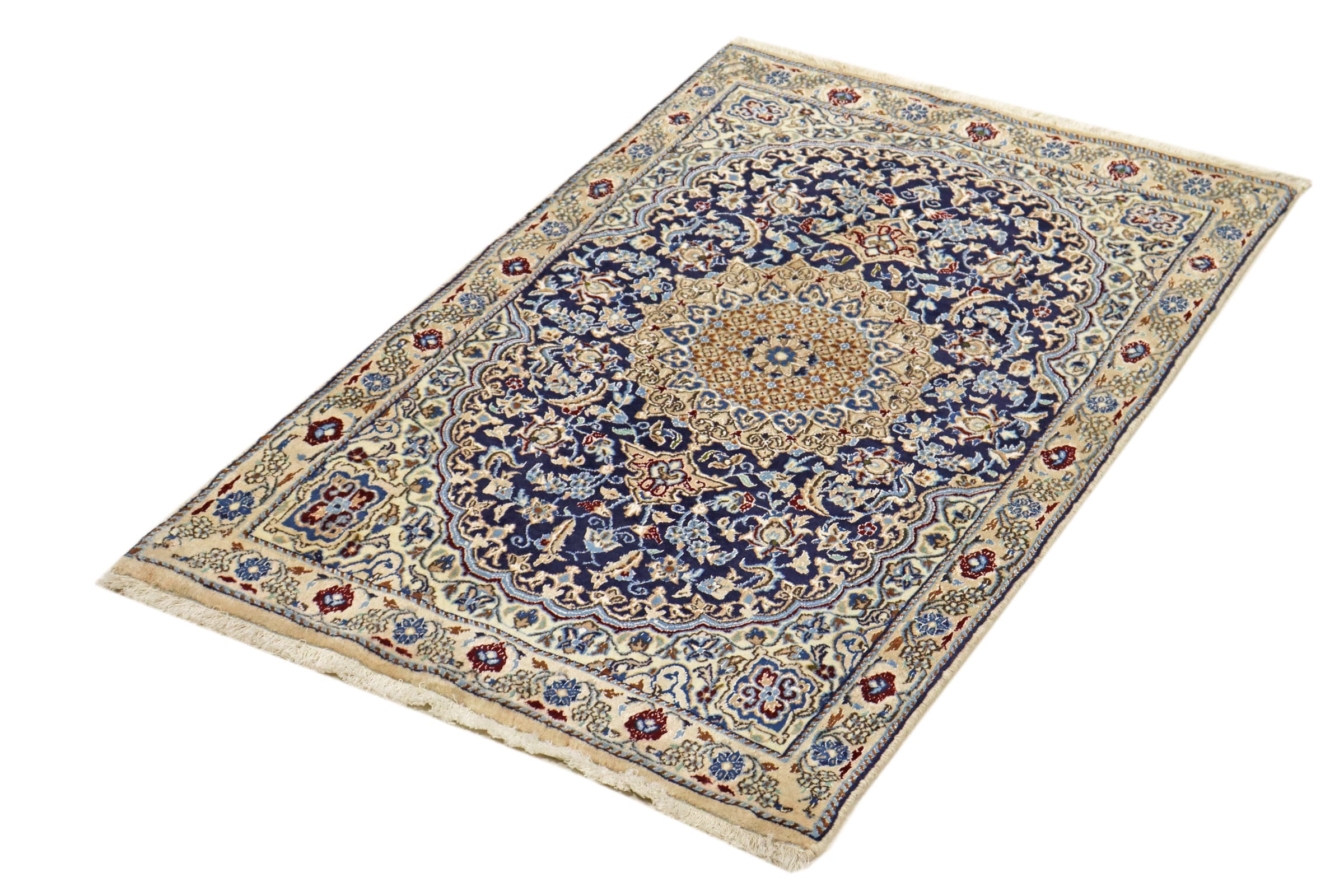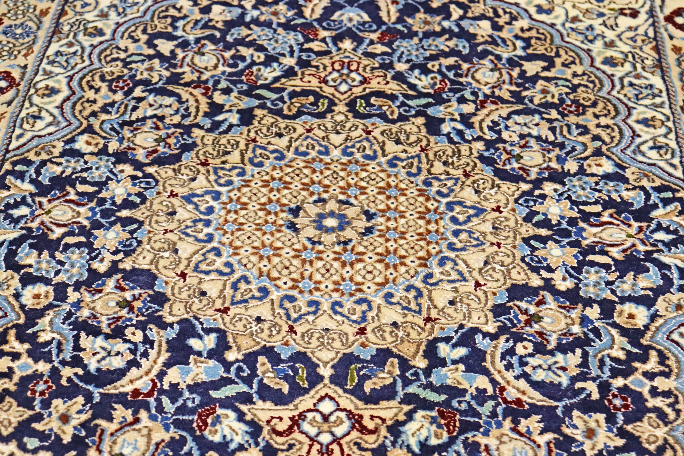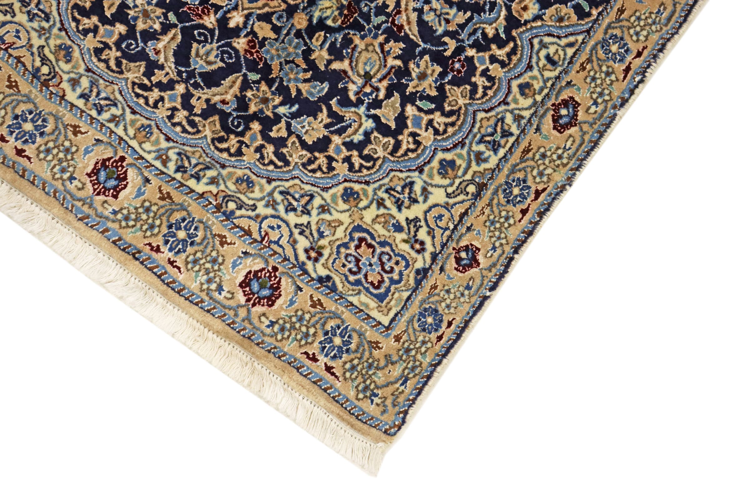 Naïn est une ville d'Iran particulièrement célèbre pour ses tapis noués à la main. La ville de Naïn est située dans la province d'Ispahan, dans le centre de l'Iran. Cette ville a une longue tradition dans la fabrication de tapis et est connue pour ses tapis noués à la main de grande qualité, appréciés pour leur artisanat raffiné, leurs motifs délicats et l'utilisation de matériaux de qualité. Ils sont fabriqués à partir de laine de qualité supérieure, avec des parties en soie incorporées dans les motifs, ce qui leur confère un éclat supplémentaire. Ces tapis sont connus pour leur densité de nouage élevée et leur texture fine et sont souvent appréciés comme pièces de collection et œuvres d'art. Naïn est un site important pour l'industrie du tapis en Iran et une source de tapis de grande qualité.