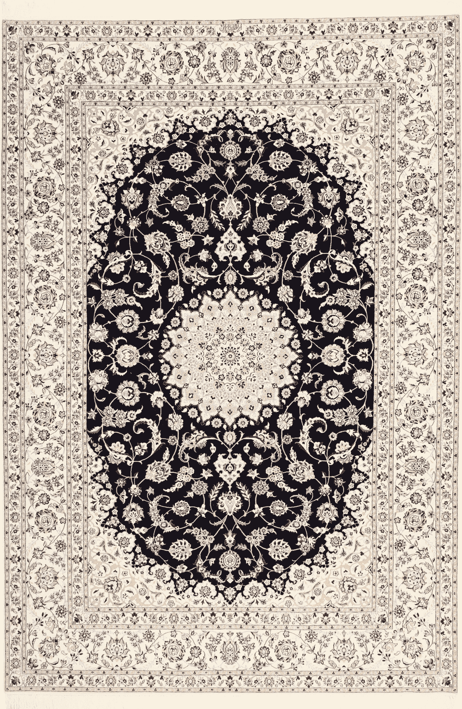 Les noueurs expérimentés travaillent souvent plus d'un an sur un tapis Naïn très fin. Les dessins varient de motifs floraux à des motifs géométriques, souvent dans des tons de bleu et de blanc. Traditionnellement, les tapis Naïn sont fabriqués en laine de haute qualité, souvent avec des accents de soie pour plus d'éclat et d'élégance. Grâce à la finesse de leurs matériaux et à leur finition soignée, les tapis Naïn sont considérés comme extrêmement résistants et durables.